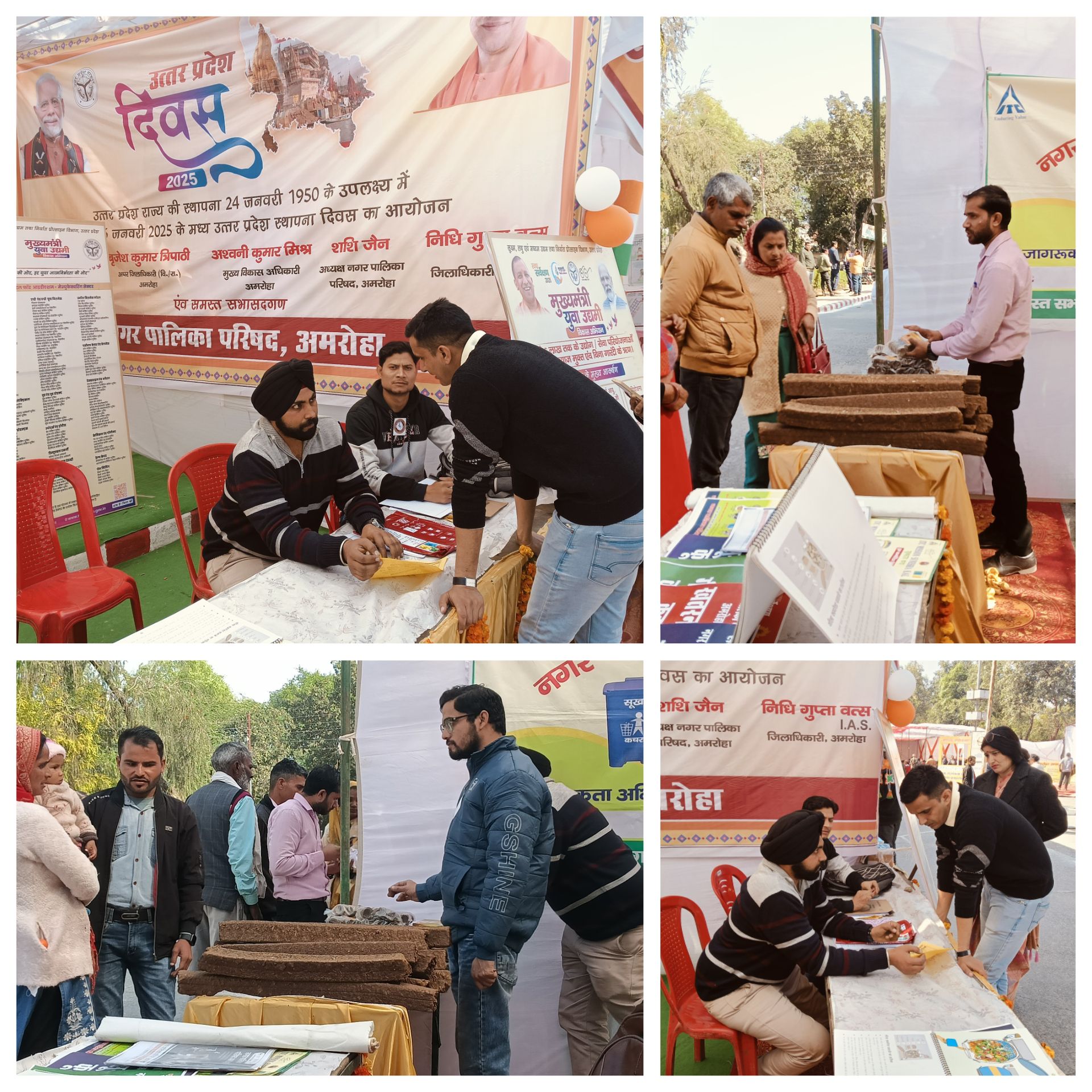 | 96 | 25/01/2025 | दिनांक 24 जनवरी 2025 को जिला अमरोहा में नगर पालिका परिषद अमरोहा व आईटीसी मिशन सुनहरा कल के द्वारा कलेक्ट्रेट में उत्तर प्रदेश राज्य स्थापना दिवस के अवसर पर वेस्ट टू क्राफ्ट होम कंपोस्टिंग स्टॉल लगाकर गीले कचरे से जैविक खाद बनाने, स्ट्रीट वेंडर (पीएम स्वानिधि योजना), मुख्यमंत्री युवा उद्यमी विकास योजना, पीo एमo विश्वकर्मा आदि योजनाओं के आम जनमानस को लाभ के विषय में जानकारी दी व पालिका द्वारा निर्मित गौ कास्ट से बने दीपक, धूप बत्ती आदि का भी स्टॉल लगाया गया,इस अवसर पर, माननीय जिलाधिकारी महोदया श्रीमती निधि गुप्ता एवं अधिशासी अधिकारी डॉ बृजेश कुमार, डीपीएम नदीम अख्तर, परियोजना विश्लेषक(sbm) एवं आईटीसी मिशन सुनहरा कल से अर्बन कोऑर्डिनेटर शाहबाज अहमद, नगर पालिका अमरोहा से स्टॉल मे उपस्थित कर्मचारीगण श्री राहुल, श्री यमन,श्री इकबाल, एवं मोहल्ला स्वच्छता समिति अध्यक्ष उपस्थित रहे। | |