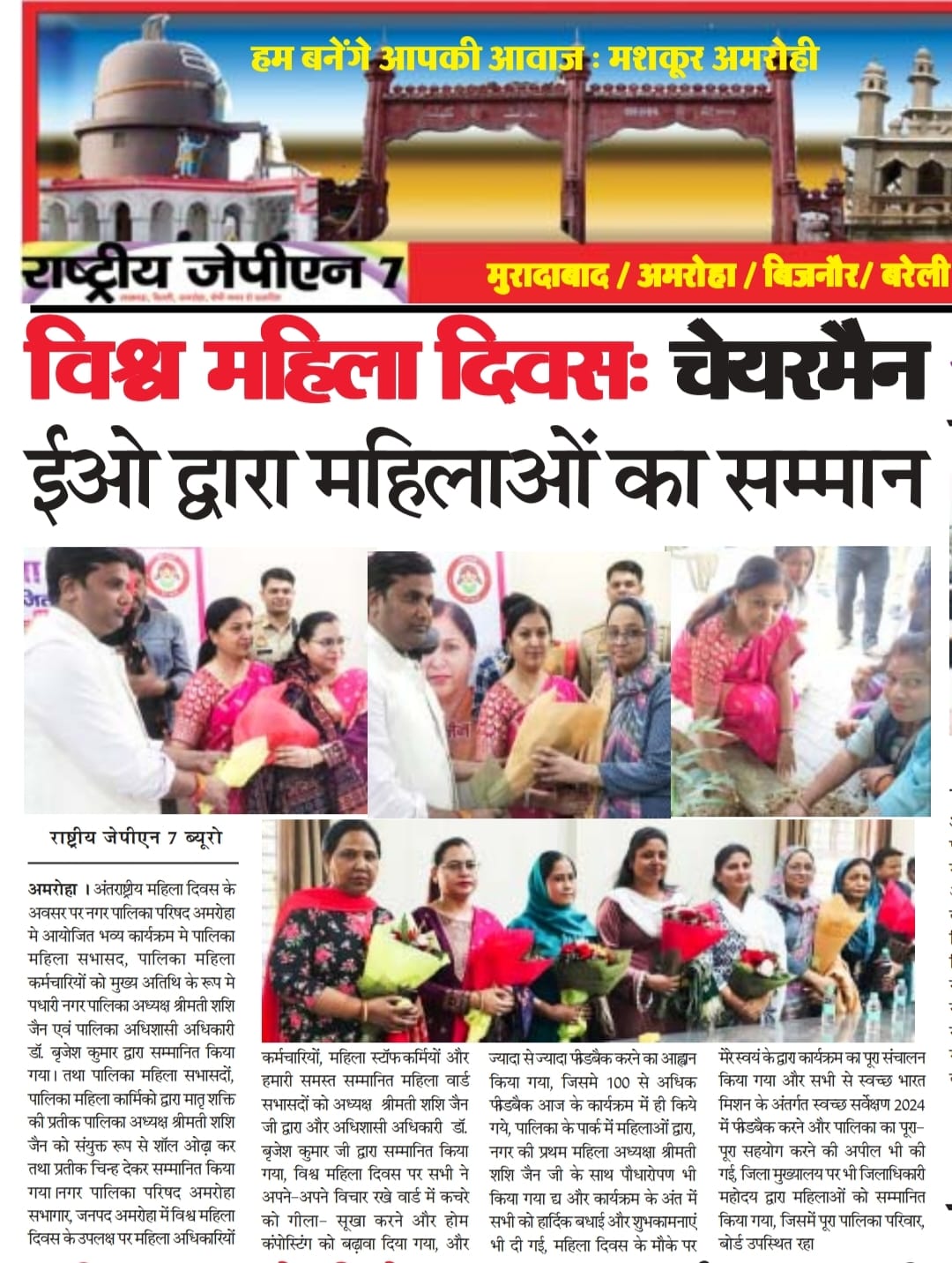 714/11/2025**मिशन शक्ति 5.0 विशेष अभियान के अंतर्गत पोस्टर प्रतियोगिता का आयोजन* महिलाओं एवं बालिकाओं की सुरक्षा, सम्मान एवं स्वावलम्बन हेतु मिशन शक्ति 5.0 2025 विशेष अभियान के अंतर्गत नगर पालिका परिषद अमरोहा द्वारा महिलाओं का स्वच्छता में योगदान विषय पर पोस्टर प्रतियोगिता का आयोजन किया गया। प्रतियोगिता का उद्देश्य महिलाओं और बालिकाओं में स्वच्छता के प्रति जागरूकता बढ़ाना एवं समाज में उनके योगदान को प्रोत्साहित करना रहा। महिलाएँ अपने समुदायों में स्वच्छता के प्रति जागरूकता फैलाने, ठोस अपशिष्ट प्रबंधन में सक्रिय भूमिका निभाने तथा शौचालयों के निर्माण एवं उपयोग को बढ़ावा देने में अग्रणी भूमिका निभा रही हैं। इसके साथ ही स्वास्थ्य और स्वच्छता को बढ़ावा देना लैंगिक समानता और महिला सशक्तिकरण के लिए अत्यंत महत्वपूर्ण है, क्योंकि इससे महिलाओं और बालिकाओं के स्वास्थ्य एवं गरिमा की रक्षा होती है। इसी क्रम में आज दिनांक 13 नवम्बर 2025 अंतर्गत नगर पालिका परिषद अमरोहा द्वारा शर्मा देवी इंटर कॉलेज अमरोहा एवं हाशमी डिग्री कॉलेज अमरोहा में मिशन शक्ति 5.0 2025 विशेष अभियान के अंतर्गत इस पोस्टर प्रतियोगिता का सफल आयोजन किया गया। इस अवसर पर नगर पालिका परिषद अमरोहा से विशेष अतिथि माननीय अध्यक्ष महोदया श्रीमती शशि जैन, उप नगर आयुक्त/अधिशासी अधिकारी डॉ० बृजेश कुमार नगर पालिका परिषद अमरोहा, डी0पी0एम0 श्री नदीम अख्तर जी जनपद अमरोहा, श्री छवि शर्मा, वरिष्ठ लिपिक, सफाई एवं खाद्य निरीक्षक श्री मौ0 इल्तिजा जी एवं माननीय सभासदगण नगर पालिका परिषद अमरोहा, काॅलेज की प्राचार्य महोदय, अध्यापिकाओं सहित स्कूल की छात्राऐं आदि उपस्थित रहीं एवं छात्राओ की स्वछता के प्रति हौसला आवजाही की गयी विशेष अतिथियों द्वारा विजेता एवं उत्कृष्ट कार्य करने वाली छात्राओं को ट्रॉफी एवं प्रशस्ति पत्र प्रदान कर सम्मानित किया गया। कार्यक्रम के दौरान छात्राओं ने अपने सृजनात्मक पोस्टरों के माध्यम से स्वच्छता और स्वास्थ्य से जुड़े सशक्त संदेश प्रस्तुत किए। प्रतियोगिता के माध्यम से छात्राओं में स्वच्छता के प्रति जिम्मेदारी एवं समाज में सकारात्मक बदलाव लाने की प्रेरणा को बल मिला।