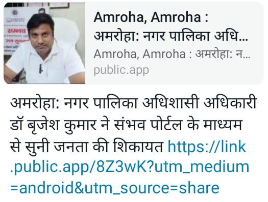 | 277 | 25/09/2023 | अमरोहा: नगर पालिका परिषद में संभव पोर्टल के माध्यम से अधिशासी अधिकारी डॉ बृजेश कुमार ने सनी शिकायतें https://link.public.app/uMSZd?utm_medium=android&utm_source=share | |