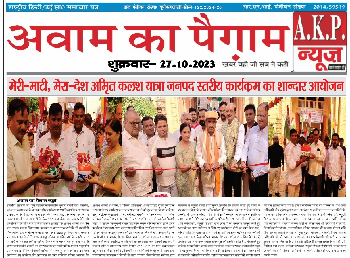 | 266 | 26/10/2023 | जनपद स्तरीय सांस्कृतिक कार्यक्रम "मेरी माटी मेरा देश/कलश यात्रा" का आयोजन नगर अमरोहा मे बहुत धूम-धाम से किया गया | |