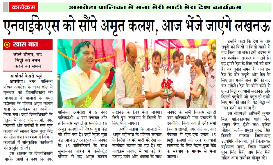 | 268 | 26/10/2023 | जनपद स्तरीय सांस्कृतिक कार्यक्रम "मेरी माटी मेरा देश/कलश यात्रा" का आयोजन नगर अमरोहा मे बहुत धूम-धाम से किया गया | |