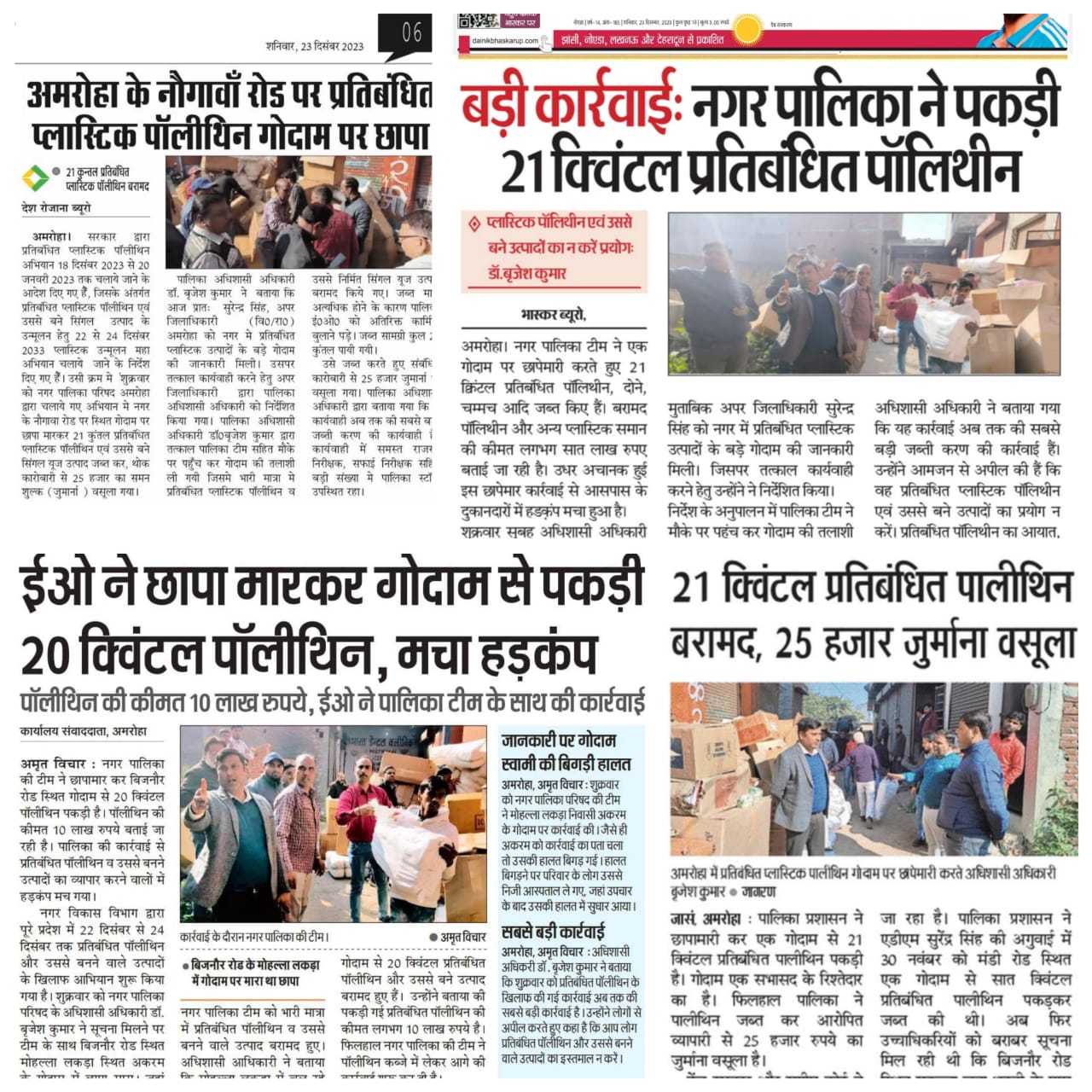 | 247 | 23/12/2023 | दिनांक 22.12.2023 को पॉलीथिन उन्मूलन अभियान के अंतर्गत डॉ बृजेश कुमार अधिशासी अधिकारी महोदय नगर पालिका परिषद अमरोहा के नेतृत्व में प्रतिबंधित पॉलीथिन व प्लास्टिक से बने गिलासों को जप्त कर जुर्माने की भी कार्यवाही की गई इस मौके पर पालिका के अधिकारी/कर्मचारी भी मौजूद रहे .......नगर पालिका परिषद अमरोहा | |