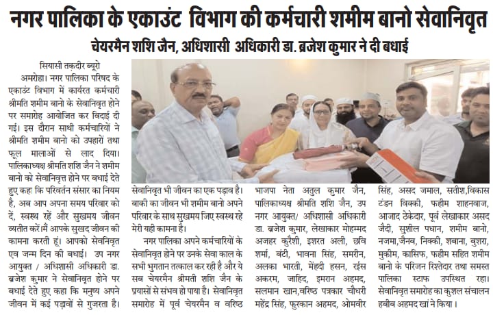 | 86 | 25/02/2025 | अमरोहा (अमन) मुस्लिम कमेटी द्वारा डॉ बृजेश कुमार उप नगर आयुक्त/अधिशासी अधिकारी महोदय को शबे ए बारात पर उत्कृष्ट व्यवस्था कराये जाने हेतु स्प्रेम भैंट देकर सम्मानित किया गया ....नगर पालिका परिषद अमरोहा💐 | |