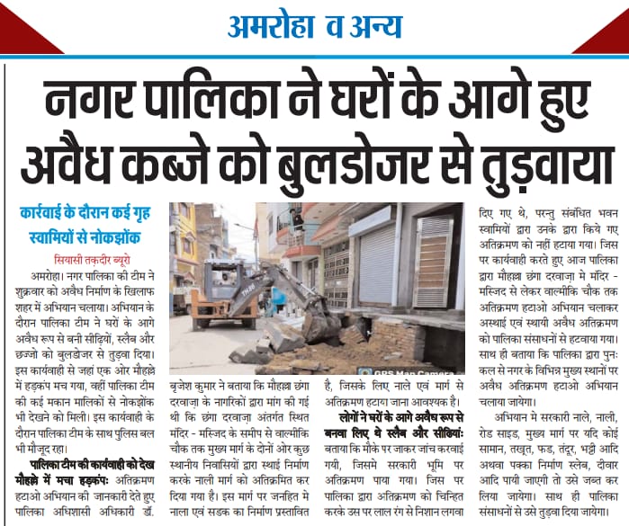 | 265 | 02/11/2023 | आज दिनाक 02/11/2023 को डॉ बृजेश कुमार अधिशासी अधिकारी महोदय, नगर पालिका परिषद् अमरोहा के नेतृत मे द्वारा चलाया गया अतिक्रमण मुक्त अभियान | |