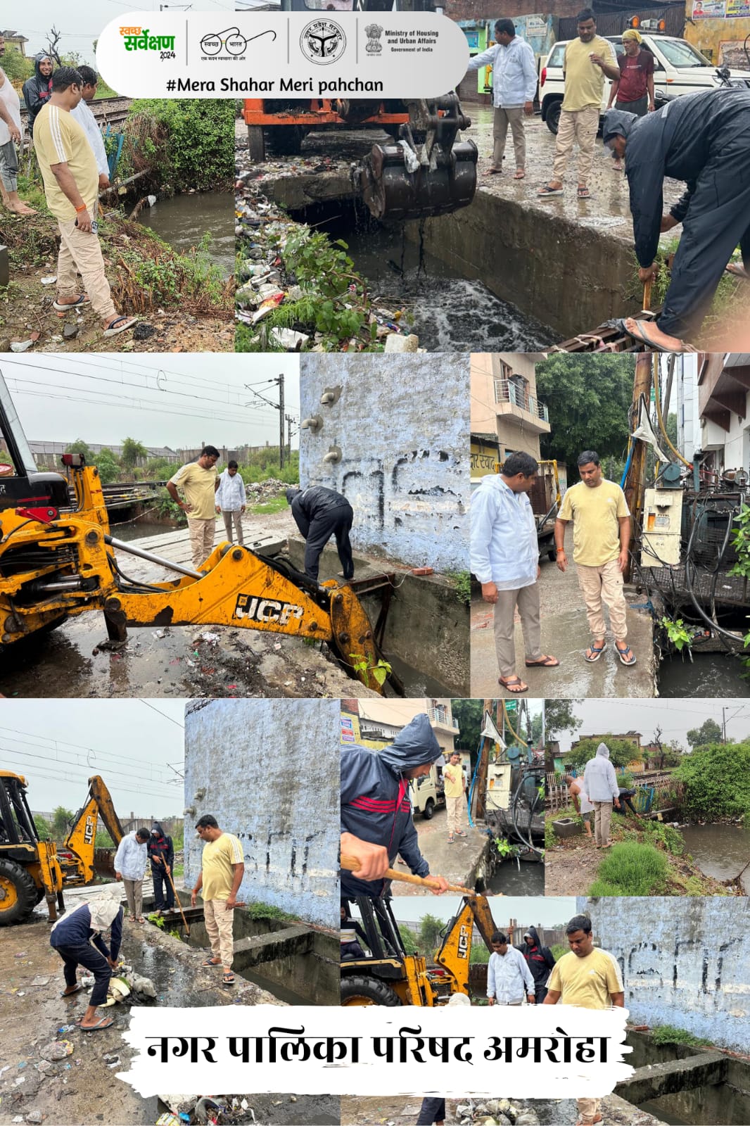| 32 | 04/08/2025 | बीती रात्रि से नगर मे लगातार हो रही भारी बारिश के कारण नगर के विभिन्न स्थानों पर हुए जल के एकत्रीकरण / जलभराव की समुचित निकासी के लिए नगर पालिका परिषद अमरोहा के अधिशासी अधिकारी डॉ. बृजेश कुमार जी द्वारा नगर मे भृमण करके नगर के मुख्य नालो, पुलियो आदि का निरीक्षण कर यह सुनिश्चित किया जा रहा है की नगर की जल निकासी वाले सभी प्रमुख नालो मे कही कोई अवरोध न हो, नाली, नालो, पुलियो मे अवरोध पाए जाने पर उसका मौके पर ही निस्तारण कराया जा रहा है जिससे नगर मे कही भी जलभराव की समस्या उत्पन्न न हो सके तथा जल निकासी का समुचित प्रबंध हो सके एवं वर्षा जल के कारण नगर वासियो को किसी भी असुविधा का सामना न करना पड़े इसके समाधान के लिए सभी संभव प्रयास किये जा रहे हैँ। निरीक्षण मे अधिशासी अधिकारी महोदय के साथ सफाई एवं खाद्य निरीक्षक श्री मोहम्मद इलतेजा, श्री जगत सिंह , सफाई प्रभारी श्री साजिद जिया अपनी सफाई कर्मियों की टीम के साथ अपने अपने क्षेत्रों मे डटे हुए हैँ। पालिका अधिशासी अधिकारी द्वारा नगर वासियो से अपील की गयी है की बीती रात्रि से हो रही भारी बारिश के कारण सम्पूर्ण नगर क्षेत्र मे जमा वर्षा जल की निकासी की व्यवस्था उनकी शीर्ष प्राथमिकता है, जिसके लिए वह स्वयं मौके पर मौजूद हैँ पालिका मे उपलब्ध संसाधनों एवं नगर मे पालिका द्वारा किये गए जल निकासी के प्रबंध बेहतर हैँ समस्त पालिका सफाई टीम इस कार्य मे लगी हुई है नगर वासी अपने घरों, दुकानों आदि का कूड़ा पालिका डोर टू डोर वाहनो मे ही डालें नाली, नाले मे किसी भी प्रकार का कूड़ा आदि न डालें जिससे नालो मे जल निकासी का प्रवाह तीव्रता से हो सके। | |