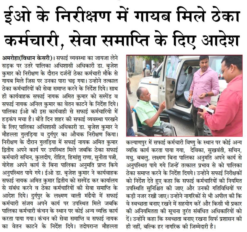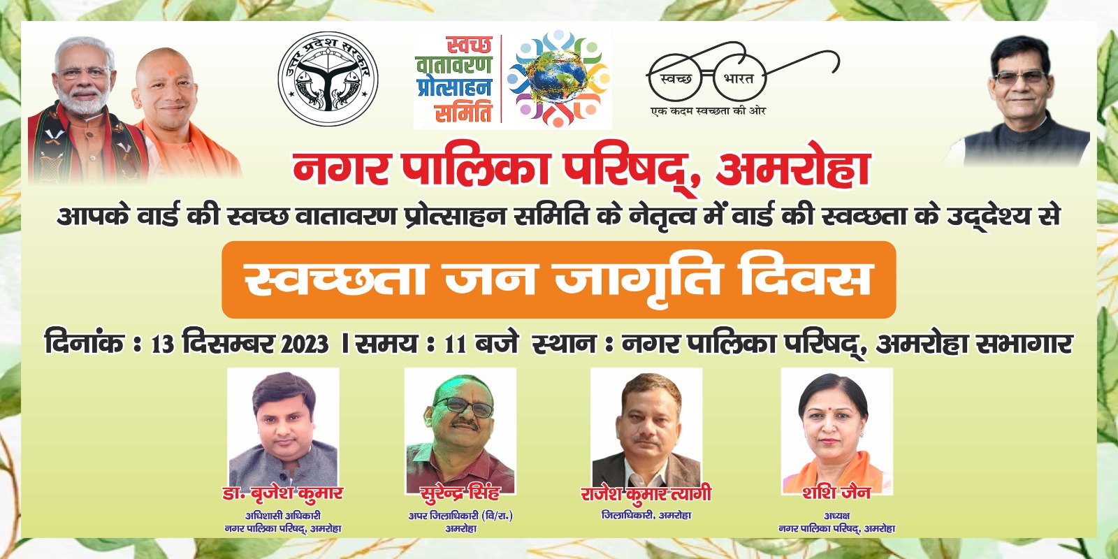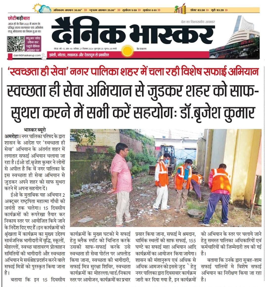 84301/10/2023डॉ बृजेश कुमार अधिशासी अधिकारी महोदय की अध्यक्षता मे कल पूरे भारत मे चल रही मुहिम 1 घंटे के लिए स्वच्छता के लिये श्रम दान 1 अक्टूबर 2023 प्रातः 10 बजे से पूरे अमरोहा मे ये अभियान चलाया गया जो की सफल रहा