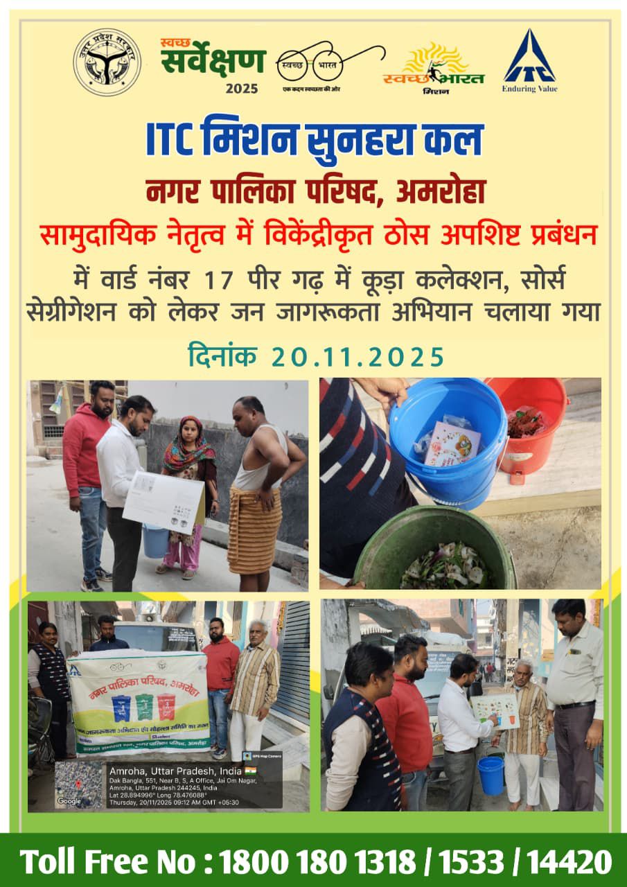 | 51 | 20/11/2025 | नगर पालिका परिषद अमरोहा एवं आईटीसी मिशन सुनहरा कल के संयुक्त तत्वाधान में वार्ड नंबर 17 पीर गढ़ में कूड़ा कलेक्शन, सोर्स सेग्रीगेशन को लेकर जन जागरूकता अभियान चलाया गया. | |
