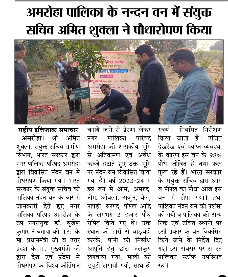 | 50 | 21/11/2025 | आज दिनांक 21/11/2025 को श्री अमित शुक्ला, संयुक्त सचिव ग्रामीण विभाग, भारत सरकार द्वारा नगर पालिका परिषद अमरोहा द्वारा विकसित नंदन वन मे पौधरोपण किया गया। भारत सरकार के संयुक्त सचिव को पालिका नंदन वन के बारे मे जानकारी देते हुए नगर पालिका परिषद अमरोहा के उप नगरायुक्त डॉ. बृजेश कुमार ने बताया की भारत के मा. प्रधानमंत्री जी व उत्तर प्रदेश के मा. मुख्यमंत्री जी द्वारा देश एवं प्रदेश मे पौधरोपण का विश्व कीर्तिमान बनाये जाने से प्रेरणा लेकर नगर पालिका परिषद अमरोहा की शासकीय भूमि से अतिक्रमण एवं अवैध कब्ज़े हटाते हुए उक्त भूमि पर नंदन वन विकसित किया गया है। वर्ष 2023-24 मे इस वन मे आम, अमरुद, नीम. आँवला, अर्जुन, बेल, पापड़ी, बरगद, पीपल आदि के लगभग 3 हज़ार पौधे रोपित किये गए थे। उक्त स्थान की तारों से बाड़बंदी करके, पानी की निर्बाध आपूर्ति हेतु छोटा नलकूप लगवाया गया, माली की ड्यूटी लगायी गयी, साथ ही स्वयं नियमित निरीक्षण किया जाता है। उचित देखरेख एवं पर्याप्त व्यवस्था के कारण इस वन के 98% पौधे जीवित हैं तथा फल फूल रहे हैं। भारत सरकार के संयुक्त सचिव द्वारा आम व पीपल का पौधा आज इस वन मे रौपा गया। तथा पालिका नंदन वन की प्रशंसा की गयी व पालिका की अन्य रिक्त एवं उचित स्थानों पर इसी प्रकार के वन विकसित किये जाने के निर्देश दिए गए। इस अवसर पर समस्त पालिका स्टॉफ उपस्थित रहा। | |