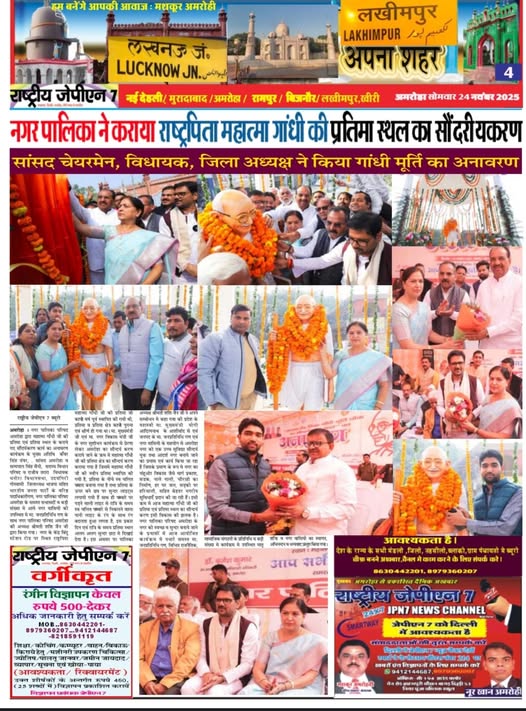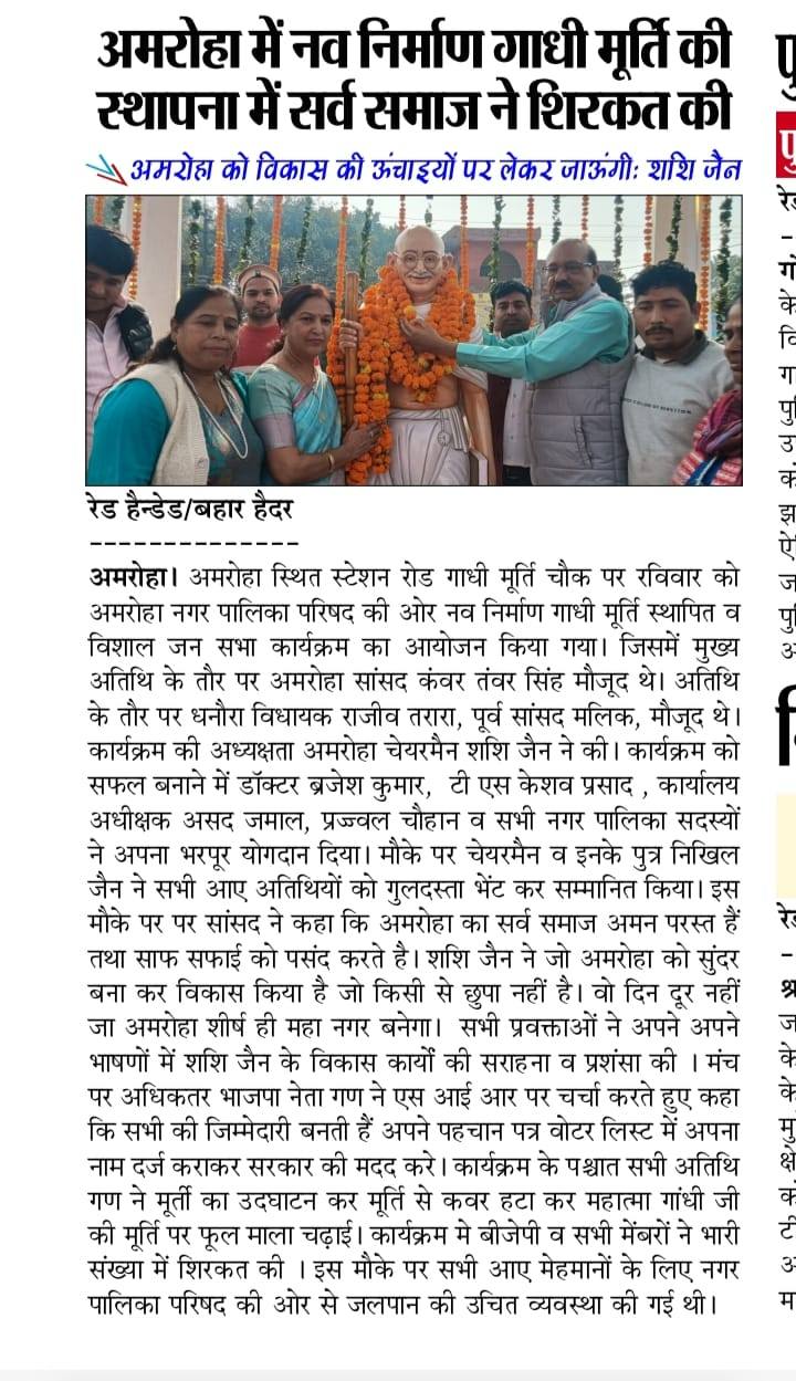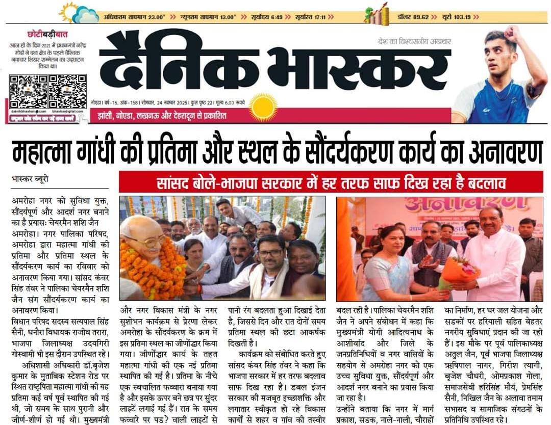 | 43 | 23/11/2025 | *Media Coverage* आज दिनांक 23/11/2025 को नगर पालिका परिषद अमरोहा द्वारा महात्मा गाँधी जी की प्रतिमा एवं प्रतिमा स्थल के कराये गए सौंदर्यकरण कार्य का अनावरण कार्यक्रम के मुख्य अतिथि श्री कँवर सिंह तंवर जी, मा. सांसद अमरोहा व श्री सत्यपाल सिंह सैनी, मा. सदस्य विधान परिषद व श्री राजीव तरारा मा. विधायक धनोरा विधानसभा, श्री उदयगिरी गोस्वामी जी ज़िलाध्यक्ष भाजपा सहित भारतीय जनता पार्टी के वरिष्ठ पदाधिकारीगण, नगर पालिका परिषद अमरोहा के समस्त सभासदों व बड़ी संख्या मे आये नगर वासियो की उपस्थित मे मा. जनप्रतिनिधि गण के साथ नगर पालिका परिषद अमरोहा की अध्यक्ष श्रीमती शशि जैन जी द्वारा किया गया। नगर के केंद्र बिंदु स्टेशन रोड पर स्थित राष्ट्रपिता महात्मा गाँधी जी की प्रतिमा जो काफ़ी वर्ष पूर्व स्थापित की गयी थी, प्रतिमा व प्रतिमा क्षेत्र काफ़ी पुराना एवं क्षीर्ण हो गया था। मा. मुख्यमंत्री जी एवं मा. नगर विकास मंत्री जी के नगर सुशोभन कार्यक्रम से प्रेरणा लेकर अमरोहा का सौन्दर्य करण कराये जाने के क्रम मे महात्मा गाँधी जी की प्रतिमा क्षेत्र का सौन्दर्य करण कराया गया है जिसमे महात्मा गाँधी जी की नवीन प्रतिमा स्थापित की गयी है, प्रतिमा के नीचे स्व चलित फवारा बनाया गया है तथा प्रतिमा के ऊपर बने छत्र पर सुन्दर लाइट्स लगायी गयी हैं साथ ही फव्वारे पर पड़ने वाली लाइट से रात्रि के समय स्व चलित फव्वारे से निकलने वाला पानी लाइट के रंग के साथ रंग बदलता हुआ लगता है, इस प्रकार दिन एवं रात्रि के समय प्रतिमा स्थल अलग अलग सुन्दर छटा मे दिखाई देता है। | |