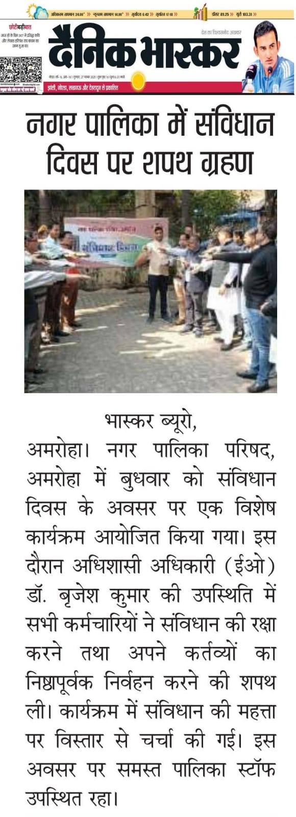 | 38 | 26/11/2025 | आज दिनांक 26 नवम्बर 2025 को भारत के संविधान दिवस (26 नवम्बर ) के उपलक्ष मे नगर पालिका परिषद अमरोहा मे उप नगर आयुक्त डॉ. बृजेश कुमार द्वारा भारत के संविधान की मूल प्रस्तावना का पाठ के साथ पालिका कार्मिको को शपथ दिलाई गयी। इस सम्बन्ध मे जानकारी देते हुए पालिका उप नगरायुक्त डॉ. बृजेश कुमार ने बताया की शासन द्वारा इस संविधान दिवस 26 नवम्बर 2025 के अवसर पर *"हमारा संविधान -हमारा स्वाभिमान"* थीम के अंतर्गत प्रदेश के समस्त जनपदों मे आयोजित किये जाने के निर्देश दिए गए हैं। उक्त के अनुपालन मे भारत के संविधान मे निहित लोकांचार और मूल्यों के प्रति प्रतिबद्धता को सुदृड किये जाने हेतु जनपद भर मे विभिन्न कार्यक्रम का आयोजन किया जा रहा है, इसी क्रम मे नगर पालिका परिषद अमरोहा मे आज भारत के संविधान की प्रस्तावना का पाठ किया गया तथा पालिका कार्मिको को शपथ दिलाई गयी। इस अवसर पर समस्त पालिका स्टॉफ उपस्थित रहा। | |