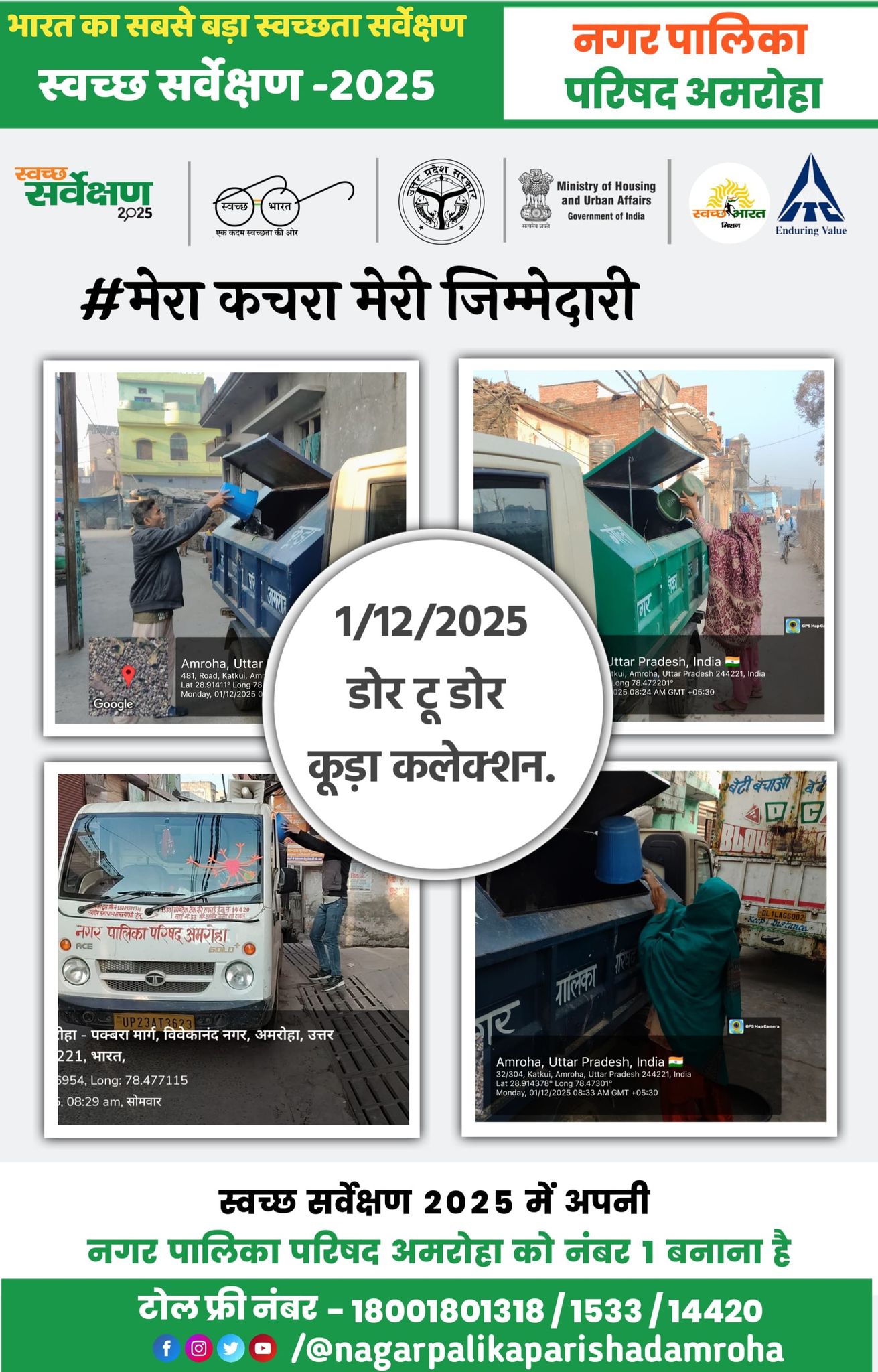 | 18 | 10/12/2025 | दिनांक 10.12.2025 नगर पालिका परिषद् अमरोहा द्वारा डोर-टू-डोर कूड़ा कलेक्शन कार्य नियमित रूप से संपन्न कराया जाता है | नगर क्षेत्र के विभिन्न वार्डों में सफाई कर्मियों की टीमों द्वारा डोर टू डोर वाहनों के माध्यम से घर-घर जाकर कचरा एकत्रित कर उसका समुचित निस्तारण कराया जाता है। स्वच्छता व्यवस्था को बनाए रखने हेतु संपूर्ण कार्य संबंधित अधिकारियों की देखरेख में संपन्न होता है गीले एवं सूखे कचरे को अलग-अलग करने हेतु लोगो को जागरूक भी किया जाता है ......नगर पालिका परिषद्, अमरोहा | |