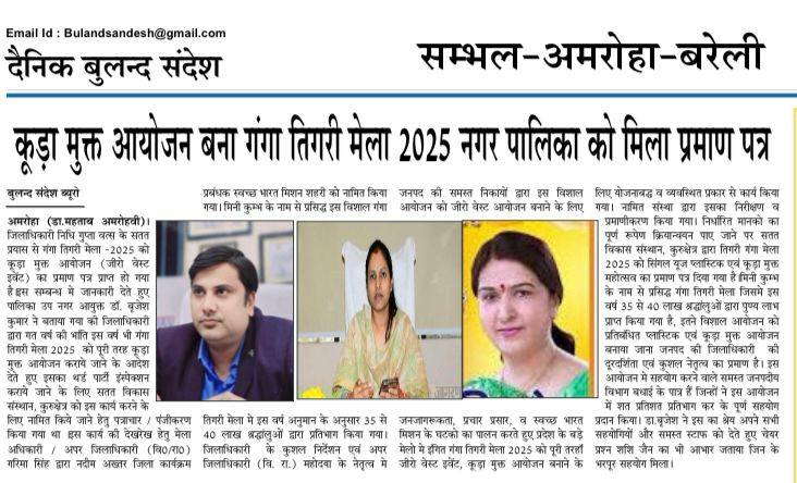 | 25 | 02/12/2025 | *कूड़ा मुक्त आयोजन बना गंगा तिगरी मेला 2025* *मिला प्रमाण पत्र* जिलाधिकारी महोदय के प्रयास से गंगा तिगरी मेला -2025 को कूड़ा मुक्त आयोजन (जीरो वेस्ट इवेंट) का प्रमाण पत्र प्राप्त हो गया है। इस सम्बन्ध मे जानकारी देते हुए पालिका उप नगर आयुक्त डॉ. बृजेश कुमार ने बताया गया की जिलाधिकारी महोदय द्वारा गत वर्ष की भांति इस वर्ष भी गंगा तिगरी मेला 2025 को पूरी तरह कूड़ा मुक्त आयोजन कराये जाने के आदेश देते हुए इसका थर्ड पार्टी इंस्पेक्शन कराये जाने के लिए *Institute of Sustainable Development, Krukshetra* को इस कार्य करने के लिए नामित किये जाने हेतु पत्राचार / पंजीकरण किया गया। इस कार्य की देखरेख हेतु मेला अधिकारी / अपर जिलाधिकारी (वि0/रा0) श्रीमती गरिमा सिंह जी द्वारा श्री नदीम अख्तर जिला कार्यक्रम प्रबंधक स्वच्छ भारत मिशन शहरी को नामित किया गया। मिनी कुम्भ के नाम से प्रसिद्ध इस विशाल गंगा तिगरी मेला मे इस वर्ष अनुमान के अनुसार 35 से 40 लाख श्रद्धांलुओं द्वारा प्रतिभाग किया गया। जिलाधिकारी महोदया के कुशल निर्देशन एवं अपर जिलाधिकारी (वि. रा.) महोदया के नेतृत्व मे जनपद की समस्त निकायों द्वारा इस विशाल आयोजन को ज़ीरो वेस्ट आयोजन बनाने के लिए जनजागरूकता, प्रचार प्रसार, व स्वच्छ भारत मिशन के घटको का पालन करते हुए प्रदेश के बड़े मेलो मे इंगित गंगा तिगरी मेला 2025 को पूरी तरहॉं जीरो वेस्ट इवेंट, कूड़ा मुक्त आयोजन बनाने के लिए योजनाबद्ध व व्यवस्थित प्रकार से कार्य किया गया। नामित संस्था द्वारा इसका निरीक्षण व प्रमाणीकरण किया गया। निर्धारित मानको का पूर्ण रूपेण क्रियान्वयन पाए जाने पर *इंस्टिट्यूट ऑफ सस्टेनेबल डेवलपमेंट, कुरुक्षेत्र* द्वारा तिगरी गंगा मेला 2025 को सिंगल यूज़ प्लास्टिक एवं कूड़ा मुक्त महोत्सव का प्रमाण पत्र दिया गया है। मिनी कुम्भ के नाम से प्रसिद्ध गंगा तिगरी मेला जिसमे इस वर्ष 35 से 40 लाख श्रद्धांलुओं द्वारा पुण्य लाभ प्राप्त किया गया है, इतने विशाल आयोजन को प्रतिबंधित प्लास्टिक एवं कूड़ा मुक्त आयोजन बनाया जाना जनपद की जिलाधिकारी महोदय की दूरदर्शिता एवं कुशल नेतृत्व का प्रमाण है। इस आयोजन मे सहयोग करने वाले समस्त जनपदीय विभाग बधाई के पात्र हैं। | |
