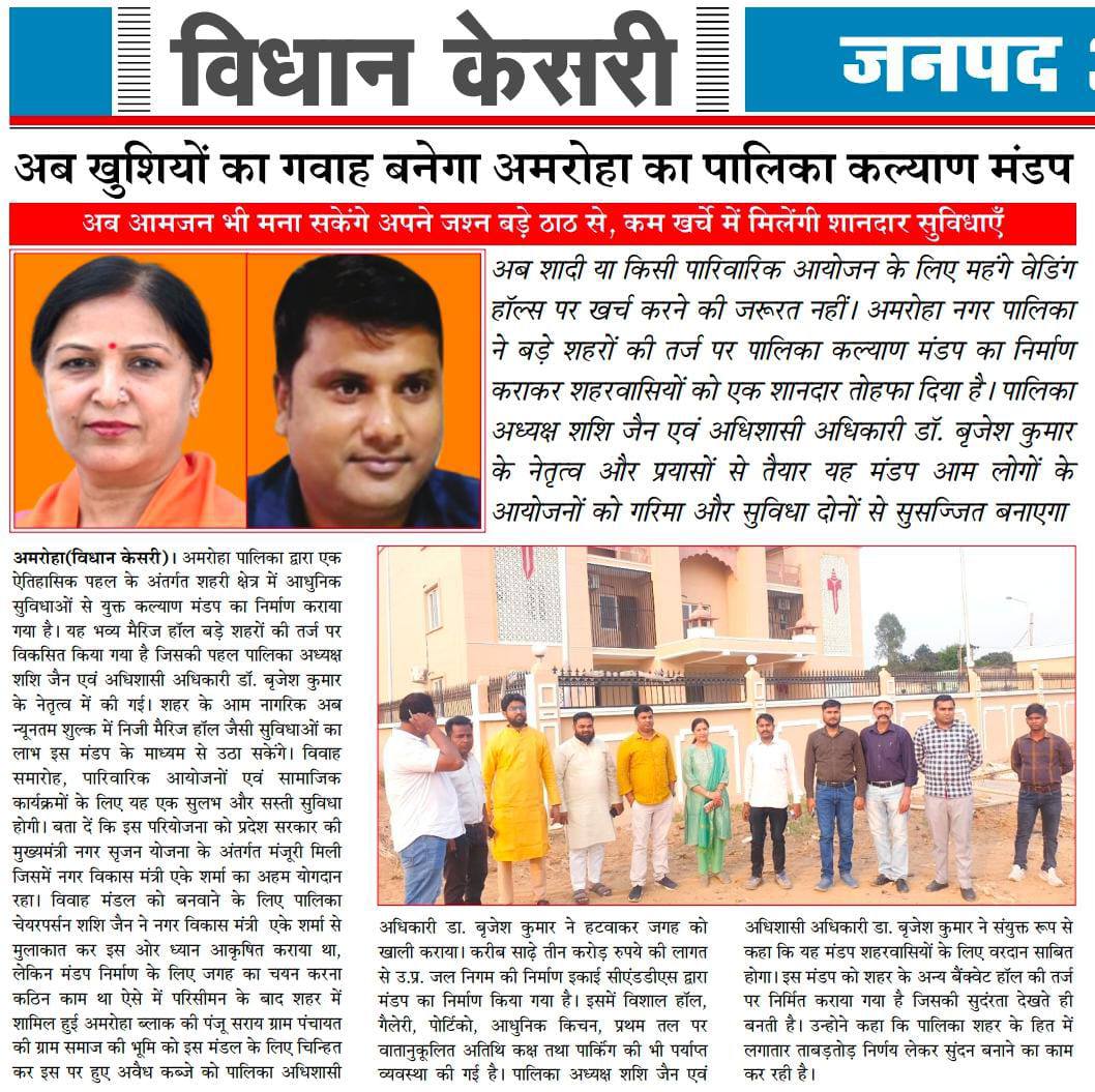 | 20 | 09/12/2025 | *कल्याण मंडप* *लोगो की खुशियों का गवाह बनेगा पालिका कल्याण मंडप* जी हाँ, बड़े नगरो की तर्ज पर नगर पालिका परिषद अमरोहा द्वारा अमरोहा पालिका क्षेत्र मे मैरिज हॉल का निर्माण कराया गया हैं, पालिका अध्यक्ष श्रीमती शशि जैन जी के प्रयासों से एवं अधिशासी अधिकारी डॉ. बृजेश कुमार के अनुभव एवं बेहतरीन कार्यशैली के परिणाम के फलस्वरुप राज्य सरकार द्वारा अमरोहा नगर पालिका को *कल्याण मंडप* के रूप मे उपहार प्रदान किया गया हैं जिसमे अब नगर के बड़े निजी शादी घरों जैसी सुविधाएँ कम खर्चे पर नगर वासियो को प्राप्त हो सकेंगी एवं सीमित खर्च पर आमजन के पारिवारिक कार्यक्रम पालिका के कल्याण मंडप मे संपन्न हो सकेंगे। | |