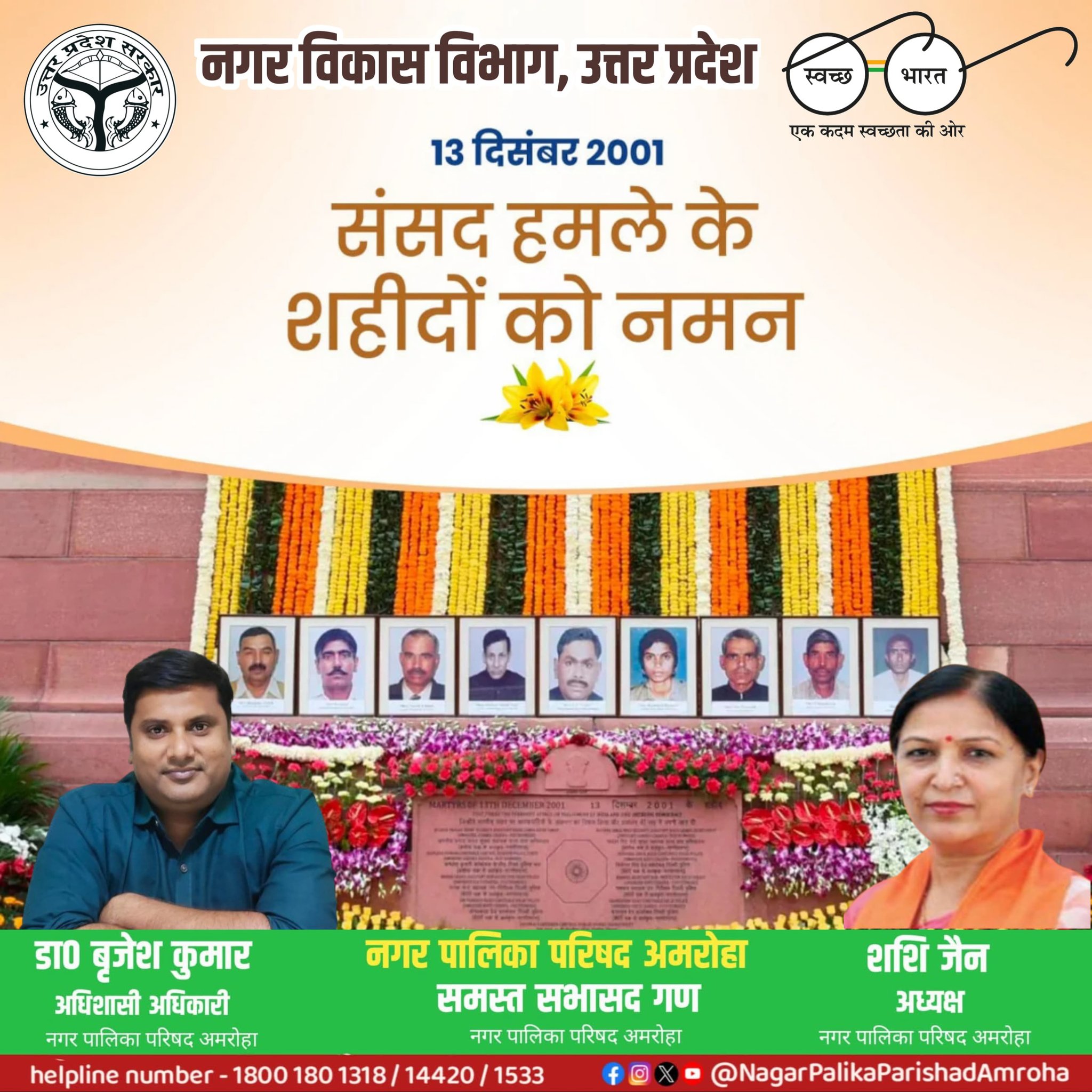 | 16 | 13/12/2025 | 13 दिसंबर 2001 को भारतीय लोकतंत्र के पवित्र मंदिर संसद भवन की रक्षा करते हुए सर्वोच्च बलिदान देने वाले देश के वीर जवानों को विनम्र श्रद्धांजलि! उनका त्याग, साहस एवं कर्तव्यनिष्ठा राष्ट्र की सुरक्षा और गरिमा के प्रति अदम्य समर्पण का प्रतीक है। | |