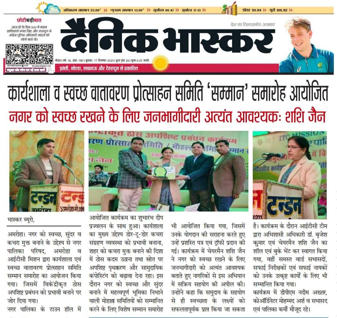 | 11 | 16/12/2025 | आज दिनांक 16 दिसंबर 2025 दिन मंगलवार को नगर पालिका के टाउन हॉल में विशेष कार्यशाला का आयोजन नगर पालिका परिषद अमरोहा और आईटीसी मिशन सुनहरा कल के तहत सामुदायिक नेतृत्व मैं विकेंद्रीकृत ठोस अपशिष्ट प्रबंधन के अंतर्गत एक दिवसीय कार्यशाला का आयोजन हुआ कार्यक्रम का शुभारंभ दीप प्रज्वलित के साथ हुआ, जिसमें मुख्य रूप से *स्वच्छ वातावरण प्रोत्साहन समिति का सम्मान समारोह* आईटीसी मिशन सुनहरा कल (ITC Mission Sunhera Kal) और नगर पालिका परिषद अमरोहा के संयुक्त तत्वावधान में एक महत्वपूर्ण कार्यक्रम का आयोजन किया गया। यह कार्यक्रम ठोस कचरा प्रबंधन के लिए डोर टू डोर को प्रभावी बनाने , शहर को कचरा मुक्त बनाने व सामुदायिक नेतृत्व में विकेंद्रीकृत ठोस अपशिष्ट प्रबंधन को समर्पित था। *कार्यशाला और सम्मान समारोह का आयोजन* इस विशेष अवसर पर, वार्ड स्तर पर स्वच्छता सुनिश्चित करने के लिए स्वच्छ वातावरण प्रोत्साहन समिति का गठन, स्रोत पर अपशिष्ट पृथक्करण (Source Segregation), और सामुदायिक कंपोस्टिंग जैसे विषयों पर कार्यशाला में अधिकारियों, डीपीएम अमरोहा, सभासदगण और कर्मचारियों द्वारा विचार साझा किए गए। अमरोहा शहर को स्वच्छ और सुंदर बनाने में अमूल्य योगदान देने वाली मोहल्ला समितियों को सम्मानित करने के लिए एक मोहल्ला समिति सम्मान समारोह भी आयोजित किया गया। 🗣️*नगर अध्यक्ष का आह्वान* कार्यक्रम में मुख्य रूप से उपस्थित नगर अध्यक्ष श्रीमती शशि जैन जी ने अमरोहा को स्वच्छ और सुंदर बनाने के लिए समुदाय को साथ लेकर चलने की पुरजोर अपील की। उन्होंने ज़ोर दिया कि जनभागीदारी के बिना स्वच्छता के लक्ष्य को प्राप्त करना असंभव है। * कार्यक्रम का मुख्य उद्देश्य* इस कार्यक्रम का प्रमुख उद्देश्य निम्नलिखित था: मोहल्ला समितियों को सम्मान: मोहल्ला समितियों द्वारा दिए गए सहयोग और अमरोहा को स्वच्छ व सुंदर बनाने में उनके अथक प्रयासों के लिए उन्हें सम्मानित करना। जागरूकता बढ़ाना: ठोस अपशिष्ट प्रबंधन के विकेंद्रीकृत मॉडल (जैसे स्रोत पर पृथक्करण और कंपोस्टिंग) के महत्व पर जागरूकता बढ़ाना। * अतिथियों का स्वागत और सम्मान* आईटीसी की टीम ने कार्यक्रम में पधारे गणमान्य अतिथियों का गर्मजोशी से स्वागत किया। स्वागत: अधिशासी अधिकारी महोदय डॉ. बृजेश कुमार जी और नगर अध्यक्ष श्रीमती शशि जैन जी का शॉल और बुके भेंट कर स्वागत किया गया। सम्मान: नगर के समस्त वार्ड सभासदों को मोहल्ला समिति और स्वच्छ वातावरण प्रोत्साहन समिति को सक्रिय करने के लिए तथा समस्त सफाई निरीक्षकों और सफाई नायकों को उनके उत्कृष्ट कार्यों के लिए प्रशस्ति पत्र और ट्रॉफी देकर सम्मानित किया गया। * उपस्थिति* इस सफल और प्रेरणादायक कार्यक्रम में विशिष्ट अतिथि के तौर पर अपर जि