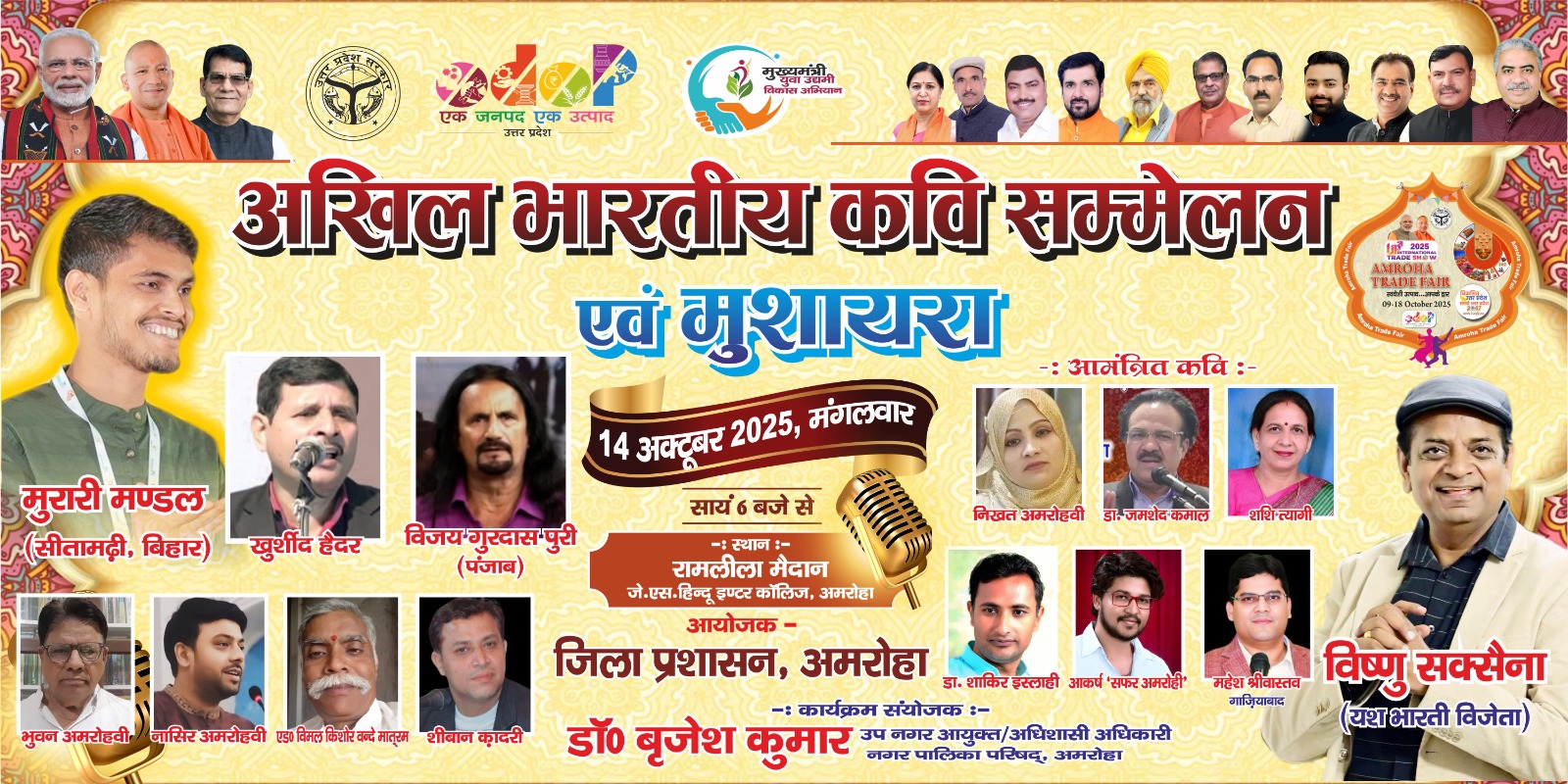 | 20 | 14/10/2025 | सभी साहित्य प्रेमी जॉन एलिया और कमाल अमरोही की धरती और गंगा जमुनी तहजीब की मिशाल अमरोहा की जनता का जिला प्रशासन अमरोहा आप सभी का अखिल भारतीय कवि सम्मेलन मे कल शाम 6 बजे स्वागत करता है आना ना भूले राम लीला ग्राउंड अमरोहा आप लोगो ने जिस तरह पिछले सालो मे मुशायरा और कवि सम्मेलन को प्यार दिया है मुझे उम्मीद है आप लोग इस अखिल भारतीय कवि सम्मेलन और मुशायरा को वही प्यार देंगे और याह मुशायरा भी अमरोहा के सफल मुशायरा की तारीख मे अपना नाम दर्ज़ करेगा | आप सभी के स्वागत का आकांक्षी अधिशाषी अधिकारी डॉक्टर बृजेश कुमार | |