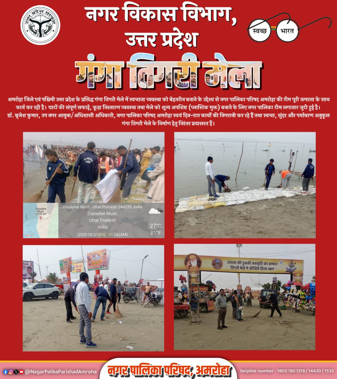 | 15 | 30/10/2025 | अमरोहा जिले एवं पश्चिमी उत्तर प्रदेश के प्रसिद्ध गंगा तिगरी मेले में स्वच्छता व्यवस्था को बेहतरीन बनाने के उद्देश्य से नगर पालिका परिषद अमरोहा की टीम पूरी तत्परता के साथ कार्य कर रही है। घाटों की संपूर्ण सफाई, कूड़ा निस्तारण व्यवस्था तथा मेले को शून्य अपशिष्ट (प्लास्टिक मुक्त) बनाने के लिए नगर पालिका टीम लगातार जुटी हुई है। डॉ. बृजेश कुमार, उप नगर आयुक्त/अधिशासी अधिकारी, नगर पालिका परिषद अमरोहा स्वयं दिन-रात कार्यों की निगरानी कर रहे हैं तथा स्वच्छ, सुंदर और पर्यावरण अनुकूल गंगा तिगरी मेले के निर्माण हेतु निरंतर प्रयासरत हैं। | |