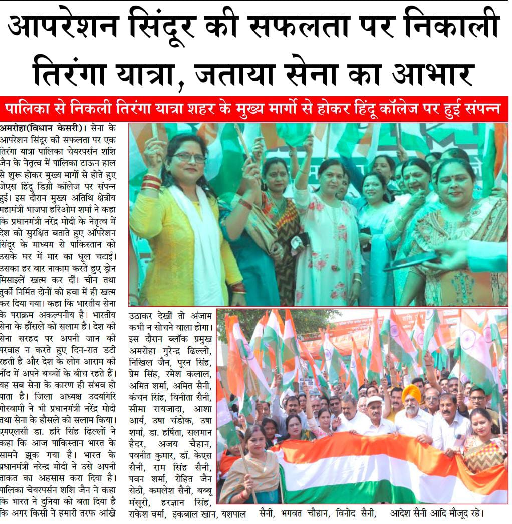 8313/08/2025हर घर तिरंगा, हर घर स्वच्छता अभियान अंतर्गत आज दिनांक 13/08/2025 को जिला प्रशासन व नगर पालिका परिषद अमरोहा द्वारा एक विशाल तिरंगा यात्रा का आयोजन किया गया। यात्रा को जिलाधिकारी महोदय, पुलिस अधीक्षक महोदय, व नगर पालिका परिषद अमरोहा की अध्यक्ष श्रीमती शशि जैन जी द्वारा संयुक्त रूप से हरी झंडी दिखाकर रवाना किया गया। यात्रा नगर के मिनी स्टेडियम से आरम्भ होकर आर्य समाज चौराहा, कोट चौराहा, मुख्य बाजार मे कोतवाली होते हुए जगदीश सरन हिन्दू कालेज के मैदान पर जाकर समाप्त हुई। इस अवसर पर जिलाधिकारी महोदय द्वारा अपने सम्बोधन मे कहा गया की देश को स्वतंत्र कराने वाले वीर सपूतो की वीरता को नमन किये जाने एवं ऐसे वीर सपूतो की महान गाथा आने वाली पीड़ी तक पहुँचाने एवं भारत की स्वतंत्रता को पूरे गौरव एवं जोश के साथ विस्तृत एवं व्यापक रूप से मनाये जाने के उद्देश्य से सरकार द्वारा हर घर तिरंगा अभियान चलाया गया है, जिसके अंतर्गत आज इस विशाल तिरंगा यात्रा निकाली गयी है। श्रीमती शशि जैन द्वारा अपने सम्बोधन मे कहा गया की भारत की स्वतंत्रता दिवस के अवसर पर हर घर तिरंगा अभियान मे आज जिला प्रशासन एवं नगर पालिका परिषद अमरोहा द्वारा आयोजित तिरंगा यात्रा मे नगर के राजनैतिक, सामाजिक, धार्मिक, व्यापारिक संगठनों, स्कूली छात्र छात्राओं, सहित भारी संख्या मे नगरवासियो द्वारा किये गए प्रतिभाग से स्पष्ट है की आज भारत का प्रत्येक नागरिक अपने देश की स्वतंत्रता एवं देश की आजादी मे अपने प्राणो की आहुति देने वाले महान. वीर सपूतो को नमन करने एवं गर्व के साथ अपनी भावनाओं को प्रकट करने के लिए तत्पर है, श्रीमती शशि जैन जी द्वारा आज की यात्रा मे भारी संख्या मे सम्मिलित हुए लोगो का अभिवादन एवं धन्यवाद किया गया। यात्रा मे सबसे आगे विभिन्न स्कूलों की झाँकिया, स्कूली छात्र छात्राएं,उसके पीछे नगर पालिका परिषद अमरोहा का बैंड तथा अंत मे मे जन प्रतिनिधि, प्रशासनिक अधिकारी, भारतीय जनता पार्टी के पदाधिकारी, नगर के विभिन्न सामाजिक, धार्मिक, व्यापारिक संगठनों से जुड़े हुए लोग, नगर पालिका परिषद अमरोहा का स्टॉफ व आमजन बड़ी संख्या मे उपस्थित रहे। यात्रा मे बड़ी संख्या मे सम्मिलित हुए स्कूली बच्चों, विभिन्न संगठनों के लोग, आमजन के लिए नगर पालिका परिषद अमरोहा द्वारा जगह जगह पेयजल एवं अल्पहार की व्यवस्था की गयी थी। पूरी यात्रा मार्ग पर नगर वासियो द्वारा पुष्प वर्षा कर, जलपान से यात्रा का स्वागत किया गया। यात्रा मे जिलाधिकारी महोदय, पुलिस अधीक्षक महोदय,नगर पालिका परिषद अमरोहा की अध्यक्ष श्रीमती शशि जैन जी, भारतीय जनता पार्टी के वरिष्ठ पदाधिकारी, नगर के प्रमुख स्कूलो के विधार्थी, नगर के विभिन्न सामाजिक, व्यापारिक, संगठन, आमजन एवं न