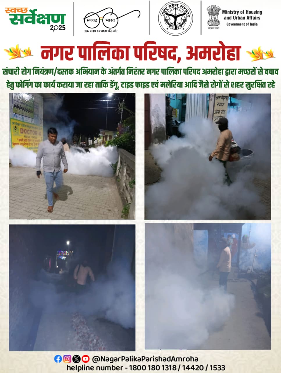 6111/10/2025संचारी रोग नियंत्रण/दस्तक अभियान के अंतर्गत निरंतर नगर पालिका परिषद अमरोहा द्वारा मच्छरों से बचाव हेतु फोगिंग का कार्य कराया जा रहा ताकि डेंगू, टाइड फाइड एवं मलेरिया आदि जैसे रोगों से शहर सुरक्षित रहे