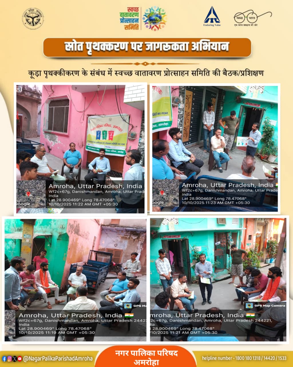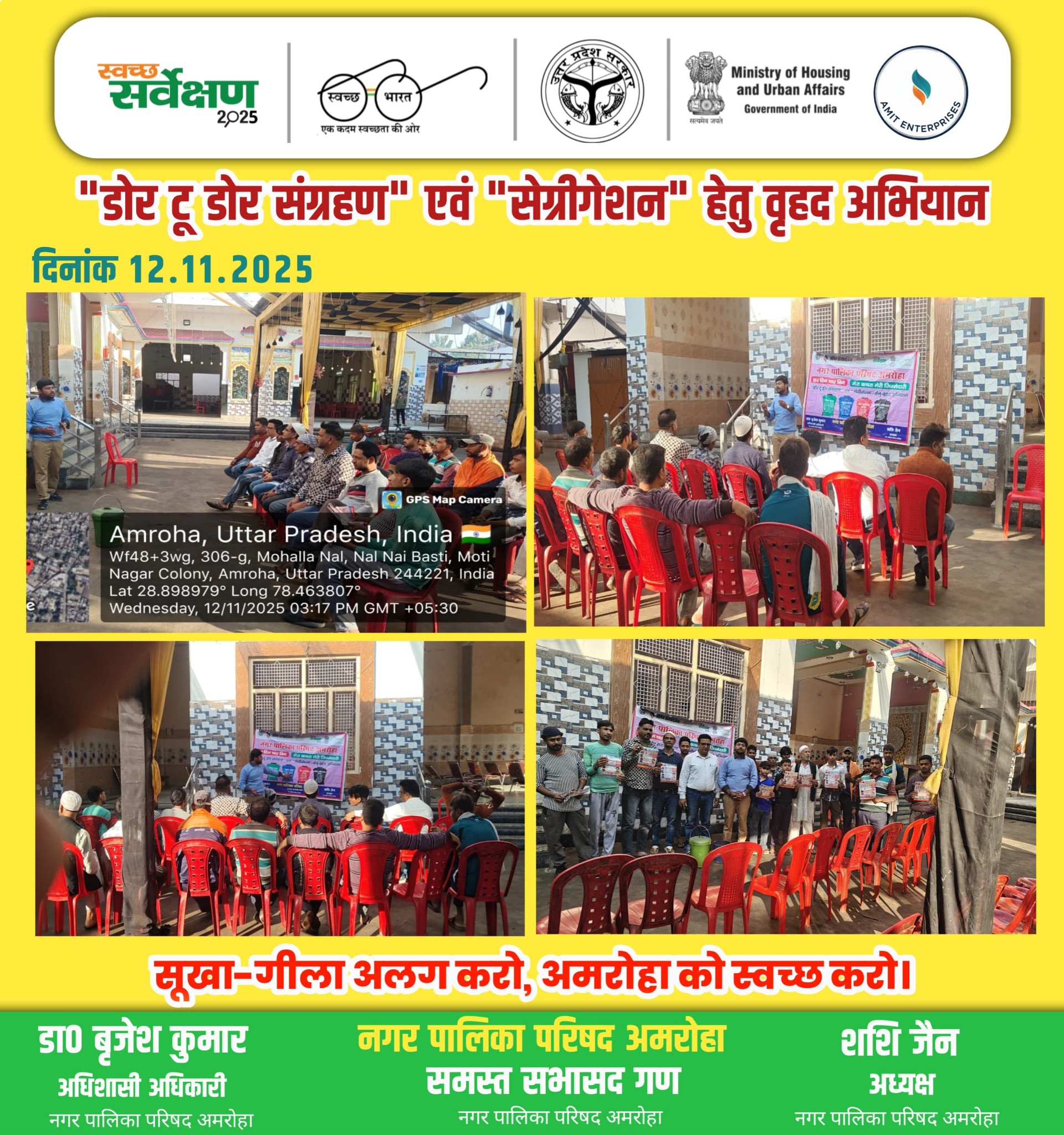 1512/11/2025आज दिनांक 12.11.2025 को नगर पालिका परिषद अमरोहा एवं अमित इंटरप्राइजेज के संयुक्त में तत्वाधान वार्ड में अवेयरनेस ट्रेनिंग अंतर्गत श्री वैभव सक्सेना जी के द्वारा वार्ड नं 14 में (डोर टू डोर सोर्स सेग्रीगेशन) एवं कचरे का पृथक्करण( गीले और सूखे कचरे को अलग-अलग करने) के संबंध में अवगत कराया गया एवं इस सम्बन्ध में एक बैठक का आयोजन किया गया जिसमें वार्ड के सफाई नायक श्री दिलीप जी वार्ड के गणमान्य लोग उपस्थित रहे।