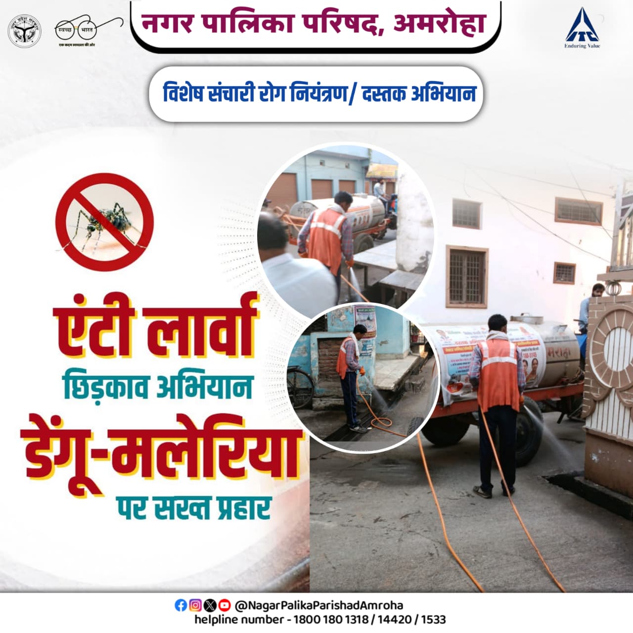 3531/10/2024दिनांक 31.10.2025 को विशेष संचारी रोग नियंत्रण एवं दस्तक अभियान के अंतर्गत नगर पालिका परिषद अमरोहा द्वारा नगर क्षेत्र में मच्छरों के नियंत्रण एवं रोकथाम के उद्देश्य से एंटी लार्वा छिड़काव कार्य व्यापक स्तर पर कराया जा रहा है। इस अभियान के माध्यम से नगर के विभिन्न वार्डों में नालियों वाले क्षेत्रों, एवं संभावित मच्छरजनित स्थलों पर एंटी लार्वा दवा का छिड़काव किया जा रहा है ताकि डेंगू, मलेरिया, टायफाइड सहित अन्य संचारी रोगों के संक्रमण को प्रभावी ढंग से रोका जा सके। नगर पालिका अमरोहा का यह अभियान नागरिकों को स्वच्छ, सुरक्षित और स्वास्थ्यवर्धक वातावरण प्रदान करने की दिशा में एक महत्वपूर्ण कदम है। पालिका प्रशासन द्वारा आमजन से भी अपील की गई है कि अपने घरों एवं आसपास पानी एकत्र न होने दें और स्वच्छता बनाए रखें, जिससे मच्छरों की उत्पत्ति पर पूर्ण रूप से नियंत्रण किया जा सके।