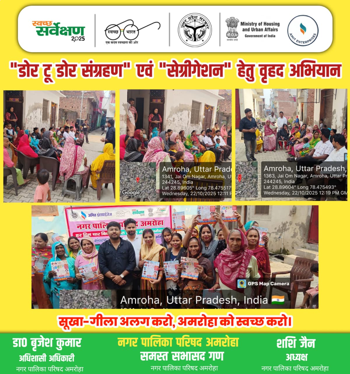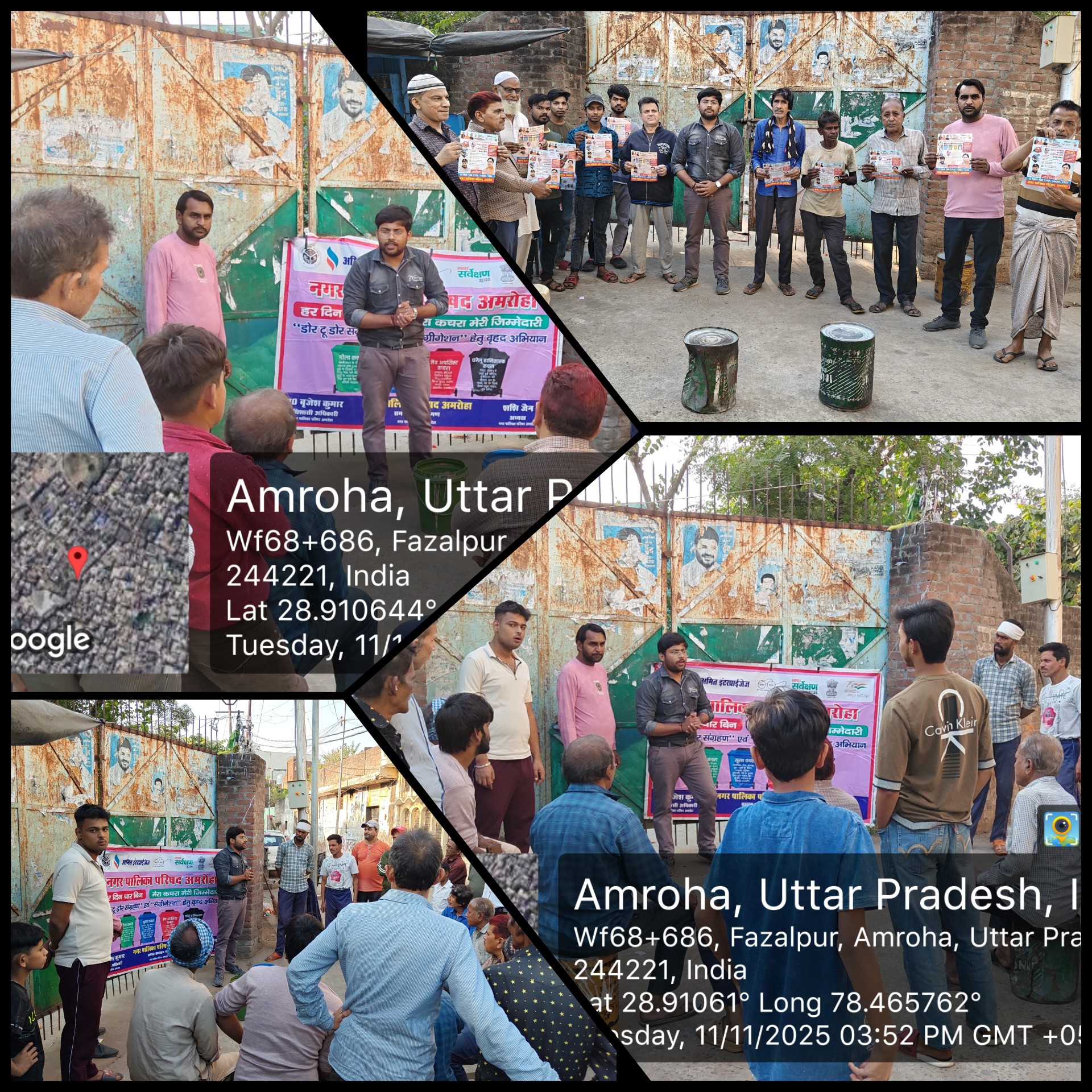 2011/11/2025आज दिनांक 11.11.2025 को नगर पालिका परिषद अमरोहा एवं अमित इंटरप्राइजेज के संयुक्त में तत्वाधान वार्ड में अवेयरनेस ट्रेनिंग अंतर्गत श्री वैभव सक्सेना जी के द्वारा वार्ड नं 23 में (डोर टू डोर सोर्स सेग्रीगेशन) एवं कचरे का पृथक्करण( गीले और सूखे कचरे को अलग-अलग करने) के संबंध में अवगत कराया गया एवं इस सम्बन्ध में एक बैठक का आयोजन किया गया जिसमें वार्ड के सफाई नायक श्री राजीव जी वार्ड के गणमान्य लोग उपस्थित रहे।