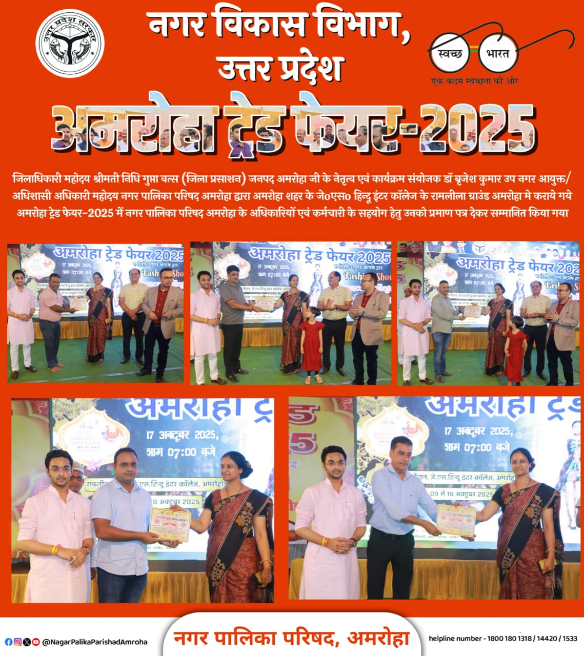 4619/10/2025जिलाधिकारी महोदय श्रीमती निधि गुप्ता वत्स (जिला प्रसाशन) जनपद अमरोहा के नेतृत्व एवं कार्यक्रम संयोजक डॉ बृजेश कुमार उप नगर आयुक्त/अधिशासी अधिकारी महोदय नगर पालिका परिषद अमरोहा द्वारा अमरोहा शहर के जेoएसo हिन्दू इंटर कॉलेज के रामलीला ग्राउंड अमरोहा मे कराये गये अमरोहा ट्रेड फेयर-2025 में नगर पालिका परिषद अमरोहा के अधिकारियों एवं कर्मचारी के सहयोग हेतु उनको जिलाधिकारी महोदया द्वारा प्रमाण पत्र देकर सम्मानित किया गया इस मौके पर मुख्य विकास अधिकारी जनपद अमरोहा व अन्य अधिकारीगण भी उपस्थित रहे