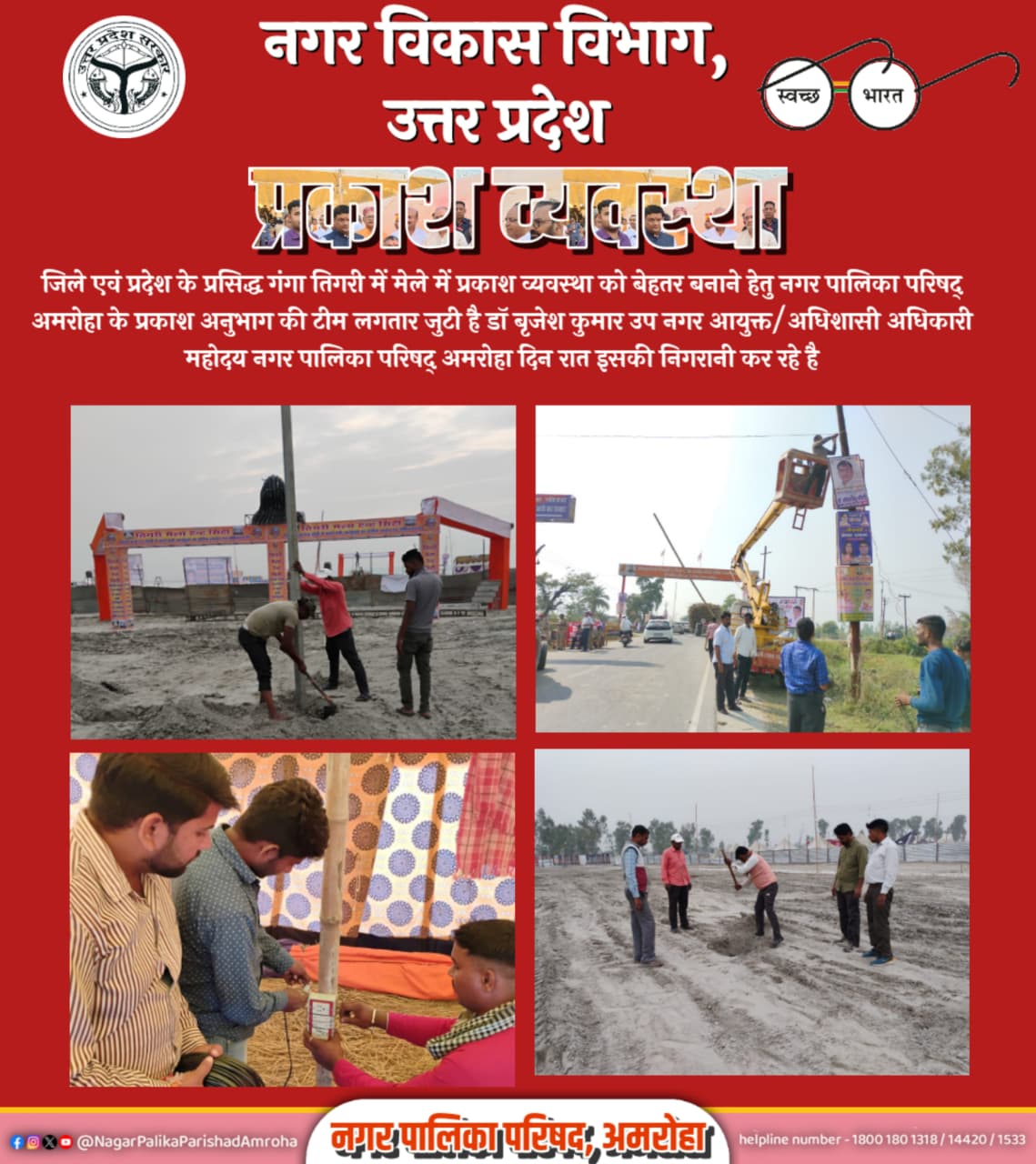4030/10/2025जिले एवं प्रदेश का प्रसिद्ध गंगा तिगरी मेला नजदीक आने के साथ ही मेले में उत्कृष्ट प्रकाश व्यवस्था सुनिश्चित करने के लिए नगर पालिका परिषद अमरोहा की प्रकाश अनुभाग की टीम पूरी मेहनत और प्रतिबद्धता के साथ कार्यरत है। मेले के प्रत्येक प्रमुख स्थल एवं मार्ग पर रोशनी की उचित व्यवस्था के लिए तकनीकी कर्मचारियों द्वारा दिन-रात लगातार कार्य किया जा रहा है। डॉ. बृजेश कुमार, उप नगर आयुक्त/अधिशासी अधिकारी, नगर पालिका परिषद अमरोहा स्वयं संपूर्ण व्यवस्था की सतत निगरानी कर रहे हैं ताकि श्रद्धालुओं और आगंतुकों को मेला स्थल पर बेहतर सुविधाएं प्राप्त हो सकें।