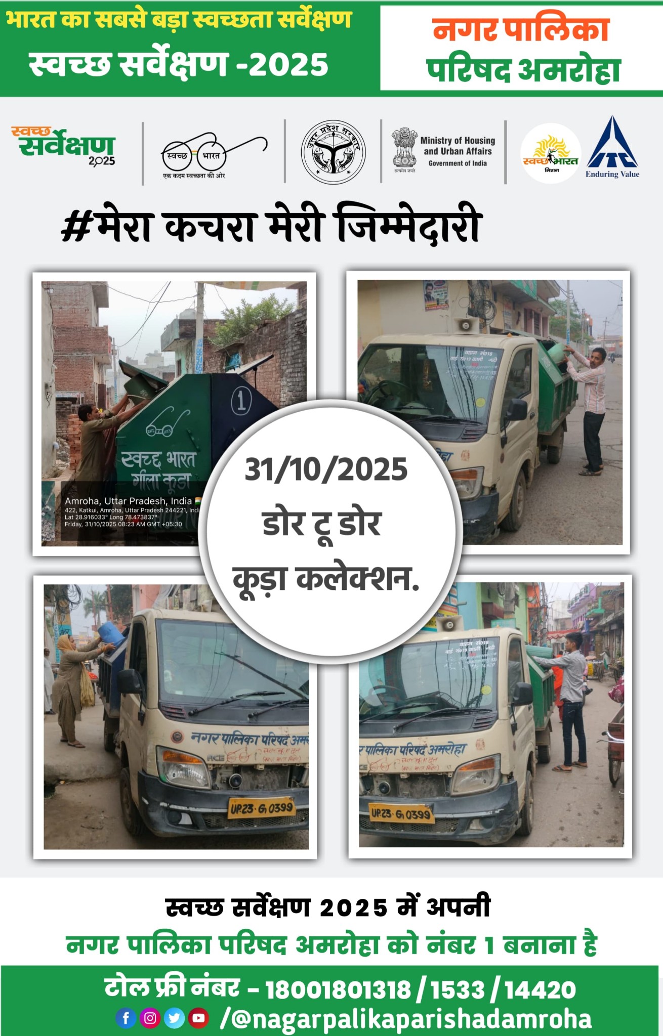 3631/10/2025आज दिनांक 31.10.2025 नगर पालिका परिषद् अमरोहा द्वारा डोर-टू-डोर कूड़ा कलेक्शन कार्य नियमित रूप से संपन्न कराया जाता है | नगर क्षेत्र के विभिन्न वार्डों में सफाई कर्मियों की टीमों द्वारा डोर टू डोर वाहनों के माध्यम से घर-घर जाकर कचरा एकत्रित कर उसका समुचित निस्तारण कराया जाता है। स्वच्छता व्यवस्था को बनाए रखने हेतु संपूर्ण कार्य संबंधित अधिकारियों की देखरेख में संपन्न होता है गीले एवं सूखे कचरे को अलग-अलग करने हेतु लोगो को जागरूक भी किया जाता है ......नगर पालिका परिषद्, अमरोहा