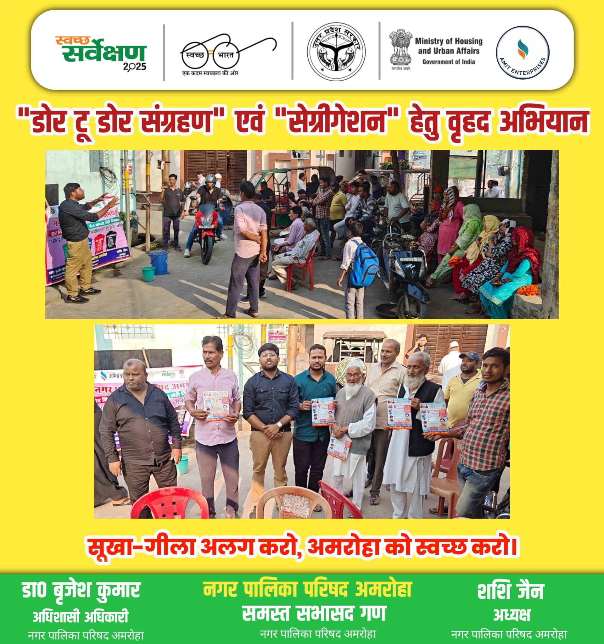 4822/10/2025स्वच्छ सर्वेक्षण अभियान नगर पालिका परिषद अमरोहा के द्वारा वैभव सक्सैना जी द्वारा गीला कूड़ा और सुख कूड़ा के विषय में समझाया गया जिसमें वार्ड नंबर 17 पीरगढ़ के सम्मानित व्यक्ति और अजय सैनी सभासद एसोसिएशन अध्यक्ष नगर पालिका परिषद अमरोहा मौजूद रहे