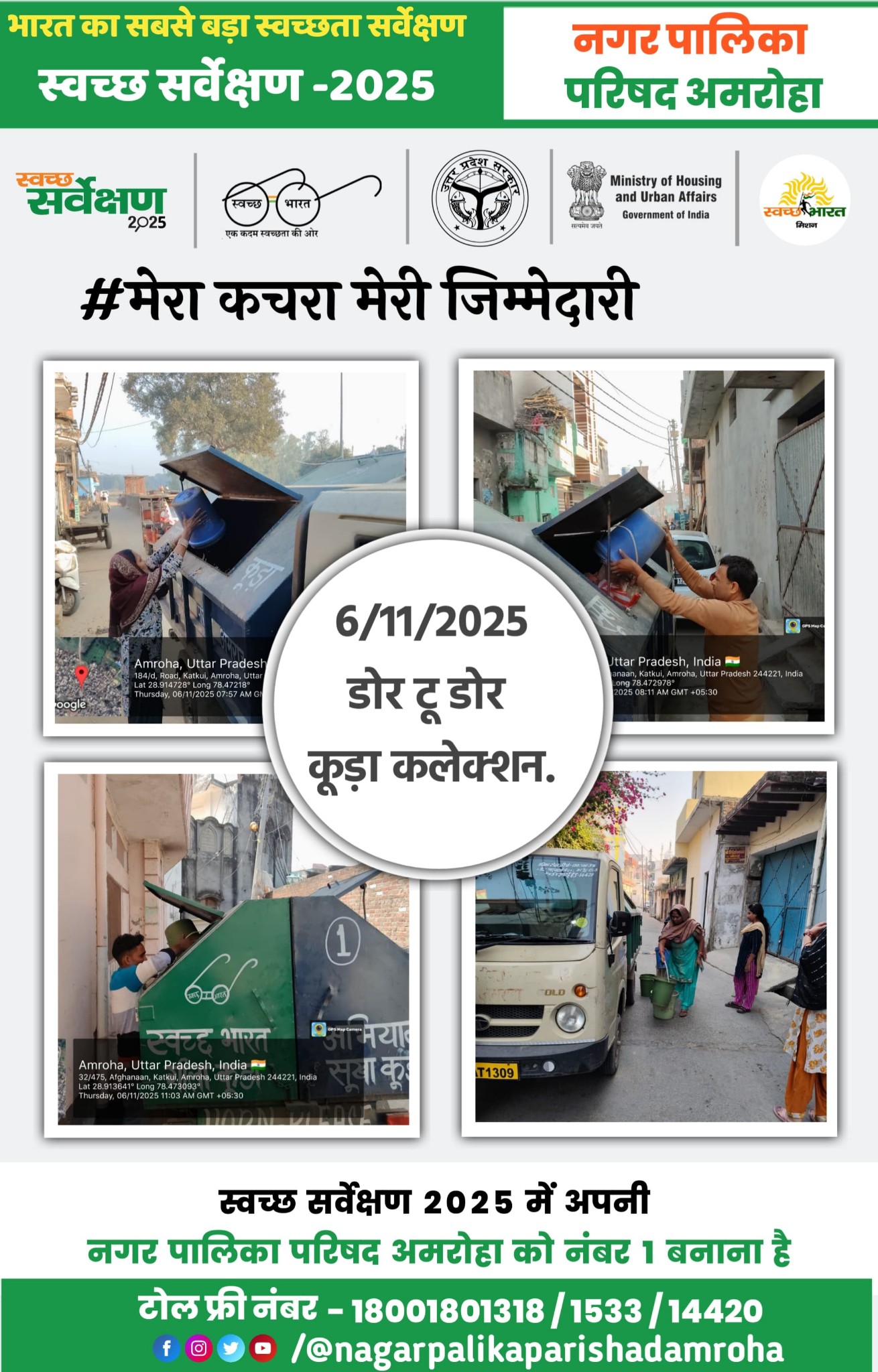 2906/11/2025दिनांक 06.11.2025 नगर पालिका परिषद् अमरोहा द्वारा डोर-टू-डोर कूड़ा कलेक्शन कार्य नियमित रूप से संपन्न कराया जाता है | नगर क्षेत्र के विभिन्न वार्डों में सफाई कर्मियों की टीमों द्वारा डोर टू डोर वाहनों के माध्यम से घर-घर जाकर कचरा एकत्रित कर उसका समुचित निस्तारण कराया जाता है। स्वच्छता व्यवस्था को बनाए रखने हेतु संपूर्ण कार्य संबंधित अधिकारियों की देखरेख में संपन्न होता है गीले एवं सूखे कचरे को अलग-अलग करने हेतु लोगो को जागरूक भी किया जाता है ......नगर पालिका परिषद्, अमरोहा