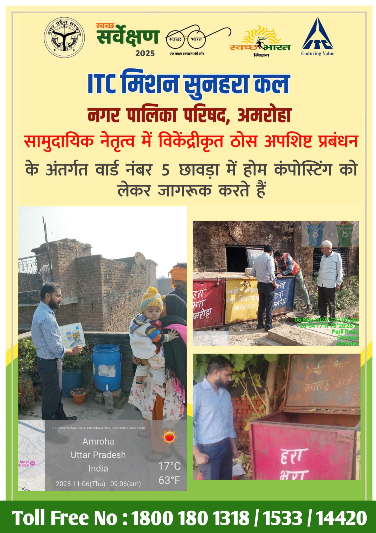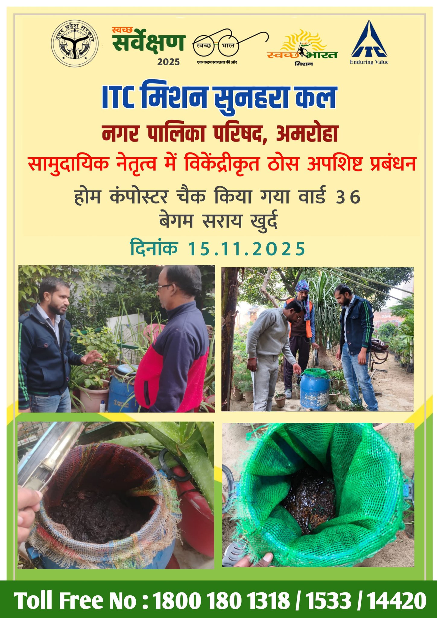 2111/11/2025नगर पालिका परिषद अमरोहा एवं आईटीसी मिशन सुनहरा कल के संयुक्त तत्वाधान में वार्ड नंबर 21 आवास विकास में मोहल्ले वासियों को होम कंपोस्टिंग को लेकर जागरूक किया गया.