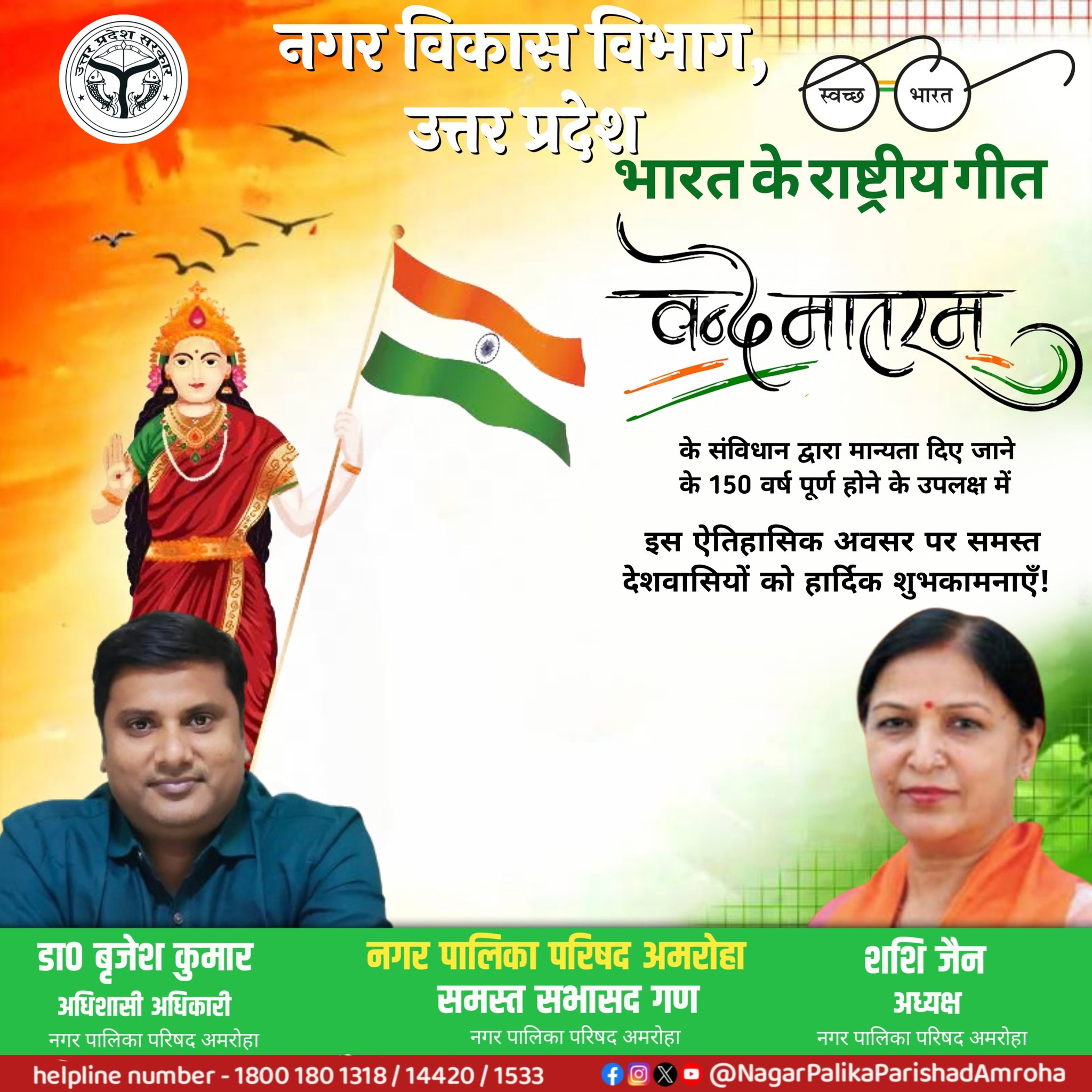 7615/08/2025आज दिनांक 15 अगस्त 2025 को स्वतन्त्रता दिवस व हर घर तिरंगा, हर घर स्वच्छता अभियान के अन्तर्गत नगर पालिका परिषद् अमरोहा द्वारा नगर पालिका अमरोहा के टाउन हॉल पर माननीय अध्यक्ष महोदया श्रीमती शशि जैन एवं डॉ बृजेश कुमार उप नगर आयुक्त/अधिशासी अधिकारी नगर पालिका परिषद अमरोहा एवं जनप्रतिनिधियों/सभासद गणों सहित ध्वजारोहण किया गया, उक्त कार्यक्रम मे जनप्रतिनिधिगण, सभासदगण व पालिका अधिकारीयों/कर्मचारीगण व आमजनमानस आदि उपस्थित रहें।