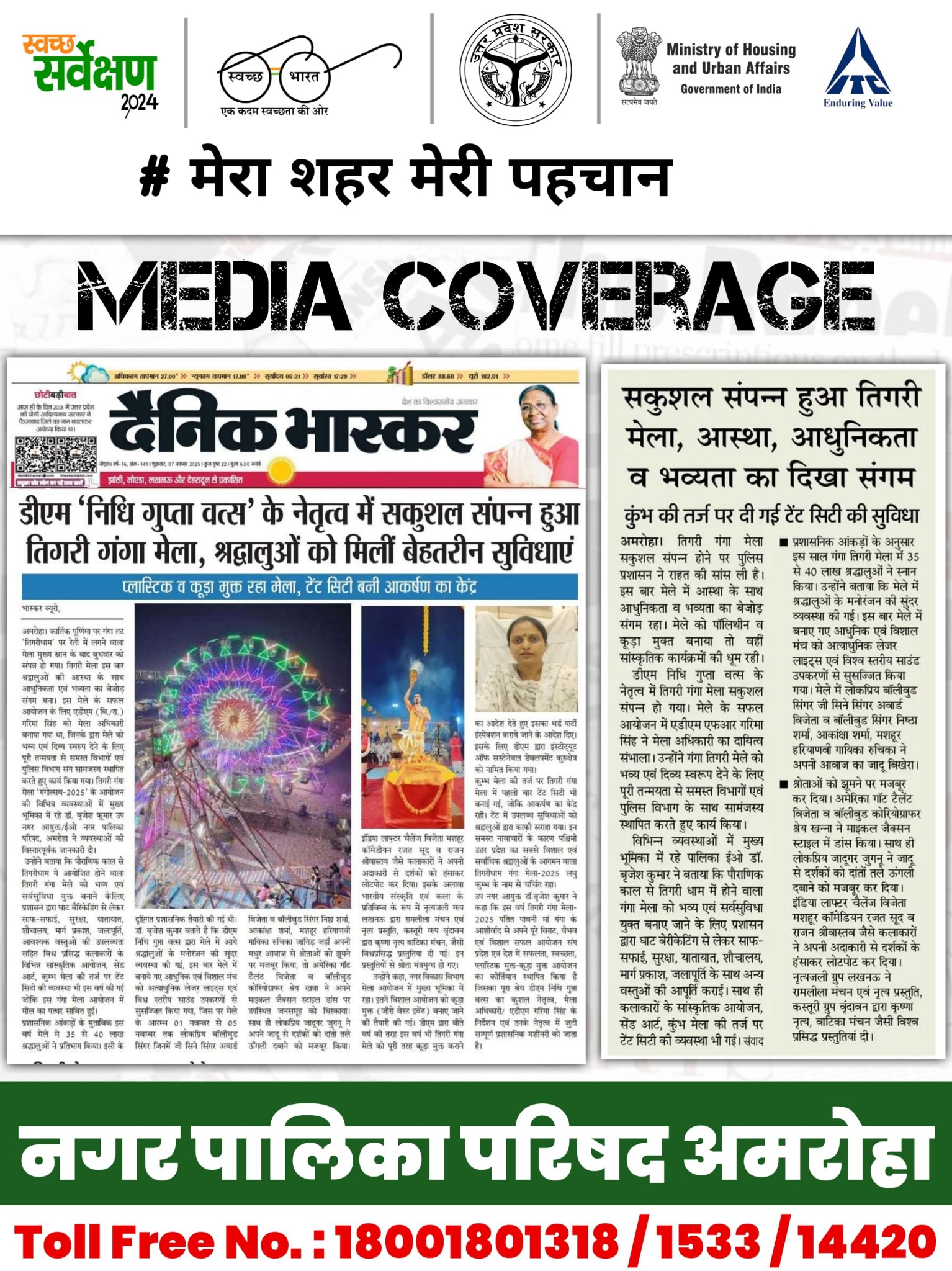 3431/10/2025दिनांक 31.10.2025 अमरोहा जिले एवं पश्चिमी उत्तर प्रदेश के प्रसिद्ध गंगा तिगरी मेले में स्वच्छता व्यवस्था को बेहतरीन बनाने के उद्देश्य से नगर पालिका परिषद अमरोहा की टीम पूरी तत्परता के साथ कार्य कर रही है। घाटों की संपूर्ण सफाई, कूड़ा निस्तारण व्यवस्था तथा मेले को शून्य अपशिष्ट (प्लास्टिक मुक्त) बनाने के लिए नगर पालिका टीम लगातार जुटी हुई है। डॉ. बृजेश कुमार, उप नगर आयुक्त/अधिशासी अधिकारी, नगर पालिका परिषद अमरोहा स्वयं दिन-रात कार्यों की निगरानी कर रहे हैं तथा स्वच्छ, सुंदर और पर्यावरण अनुकूल गंगा तिगरी मेले के निर्माण हेतु निरंतर प्रयासरत हैं।