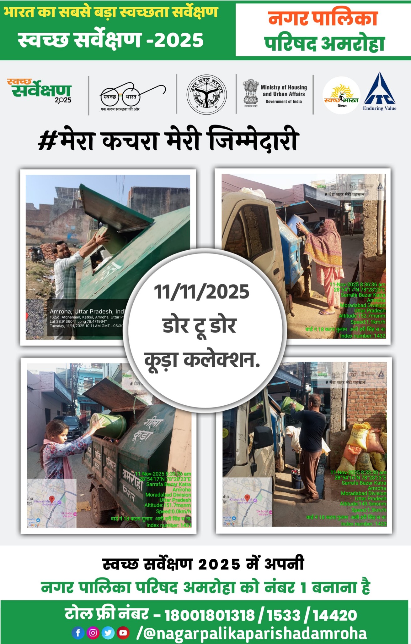 2211/11/2025दिनांक 11.11.2025 नगर पालिका परिषद् अमरोहा द्वारा डोर-टू-डोर कूड़ा कलेक्शन कार्य नियमित रूप से संपन्न कराया जाता है | नगर क्षेत्र के विभिन्न वार्डों में सफाई कर्मियों की टीमों द्वारा डोर टू डोर वाहनों के माध्यम से घर-घर जाकर कचरा एकत्रित कर उसका समुचित निस्तारण कराया जाता है। स्वच्छता व्यवस्था को बनाए रखने हेतु संपूर्ण कार्य संबंधित अधिकारियों की देखरेख में संपन्न होता है गीले एवं सूखे कचरे को अलग-अलग करने हेतु लोगो को जागरूक भी किया जाता है ......नगर पालिका परिषद्, अमरोहा