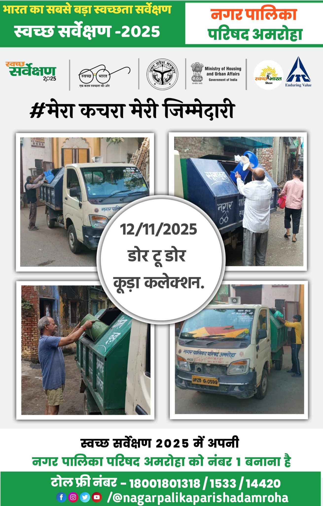 1912/11/2025दिनांक 12.11.2025 नगर पालिका परिषद् अमरोहा द्वारा डोर-टू-डोर कूड़ा कलेक्शन कार्य नियमित रूप से संपन्न कराया जाता है | नगर क्षेत्र के विभिन्न वार्डों में सफाई कर्मियों की टीमों द्वारा डोर टू डोर वाहनों के माध्यम से घर-घर जाकर कचरा एकत्रित कर उसका समुचित निस्तारण कराया जाता है। स्वच्छता व्यवस्था को बनाए रखने हेतु संपूर्ण कार्य संबंधित अधिकारियों की देखरेख में संपन्न होता है गीले एवं सूखे कचरे को अलग-अलग करने हेतु लोगो को जागरूक भी किया जाता है ......नगर पालिका परिषद्, अमरोहा