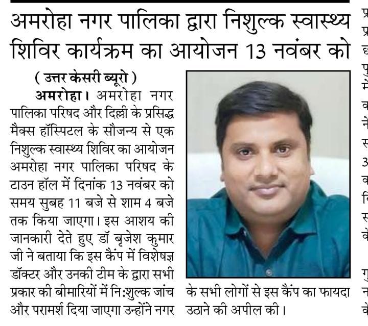 1812/11/2025*पालिका द्वारा स्वास्थ्य कैंप का आयोजन* दिल्ली के प्रसिद्ध अस्पताल बी. एल.के.- मैक्स एवं नगर पालिका परिषद अमरोहा के संयुक्त तत्वाधान मे एक विशाल स्वास्थ्य कैंप का आयोजन किया जा रहा है, जिसमे विभिन्न रोगों के विशेषज्ञ डॉक्टर्स द्वारा रोगी की जांच एवं परामर्श निशुल्क दिया जायेगा। इस सम्बन्ध मे जानकारी देते हुए पालिका के उपनगर आयुक्त डॉ. बृजेश कुमार द्वारा बताया गया की सरकार के फिट इण्डिया कार्यक्रम की प्रेरणा से नगर पालिका परिषद अमरोहा की मा. अध्यक्ष श्रीमती शशि जैन जी के प्रयासों से दिल्ली के प्रसिद्ध बी. एल के.-मैक्स अस्पताल द्वारा संयुक्त रूप से दिनांक 13 नवम्बर 2025 (ब्रहस्पतिवार) को पालिका टाउन हॉल मे विशाल स्वास्थ्य कैंप का आयोजन किया जा रहा है जिसमे विभिन्न रोगों की जांच एवं उनके निदान हेतु उचित परामर्श अस्पताल के प्रसिद्ध चिकित्सकों द्वारा पूर्णतया निशुल्क किया जायेगा। नगर की समस्त जनता से अपील है की यदि आपके परिवार मे कोई सदस्य किसी रोग से ग्रस्त है तो उन्हें पालिका के इस स्वास्थ्य शिविर मे लाकर विशेषज्ञ डॉक्टर्स से जांचे करवाकर उचित परामर्श प्राप्त करें। इस शिविर मे समस्त प्रकार की जांचे एवं परामर्श पूर्णतया निशुल्क है।