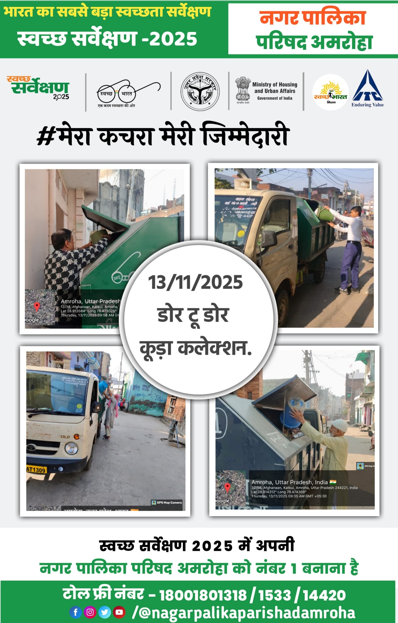 814/11/2025दिनांक 14.11.2025 नगर पालिका परिषद् अमरोहा द्वारा डोर-टू-डोर कूड़ा कलेक्शन कार्य नियमित रूप से संपन्न कराया जाता है | नगर क्षेत्र के विभिन्न वार्डों में सफाई कर्मियों की टीमों द्वारा डोर टू डोर वाहनों के माध्यम से घर-घर जाकर कचरा एकत्रित कर उसका समुचित निस्तारण कराया जाता है। स्वच्छता व्यवस्था को बनाए रखने हेतु संपूर्ण कार्य संबंधित अधिकारियों की देखरेख में संपन्न होता है गीले एवं सूखे कचरे को अलग-अलग करने हेतु लोगो को जागरूक भी किया जाता है ......नगर पालिका परिषद्, अमरोहा
